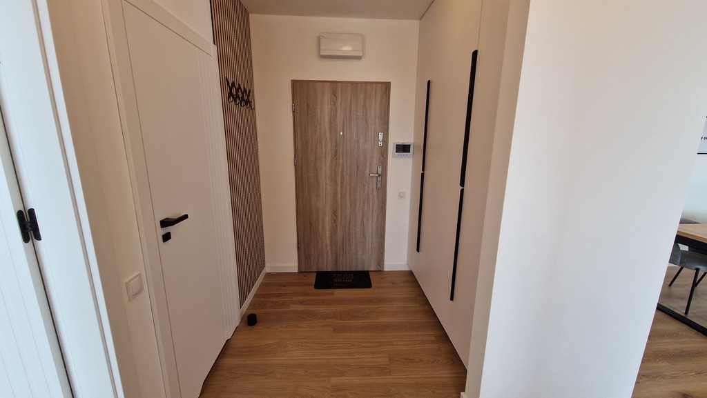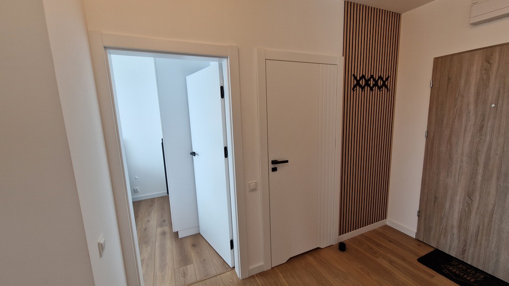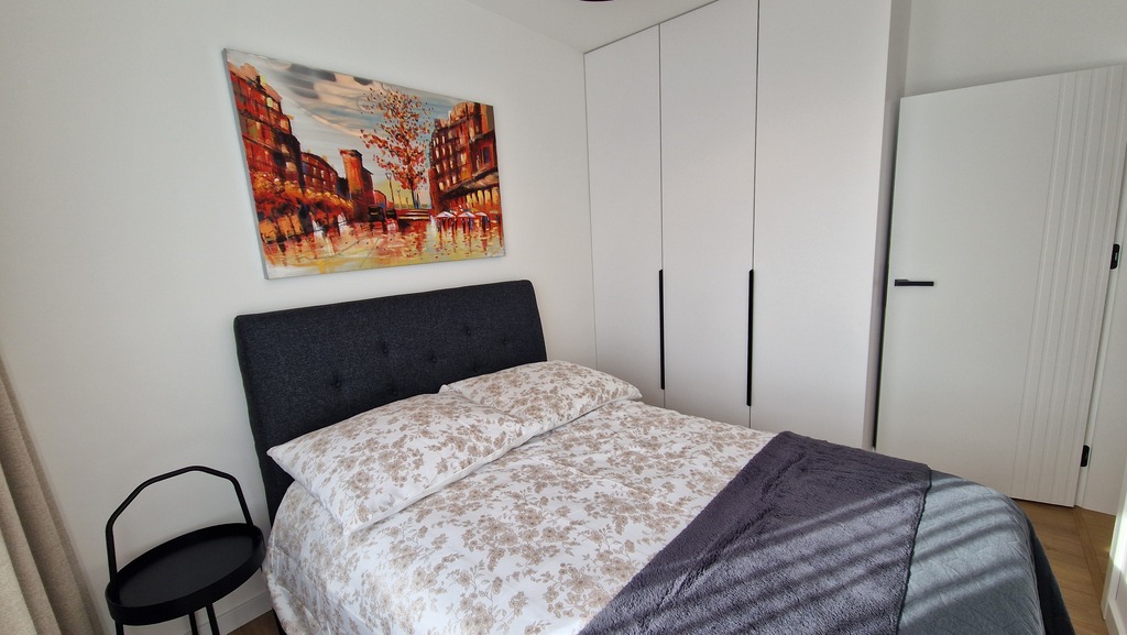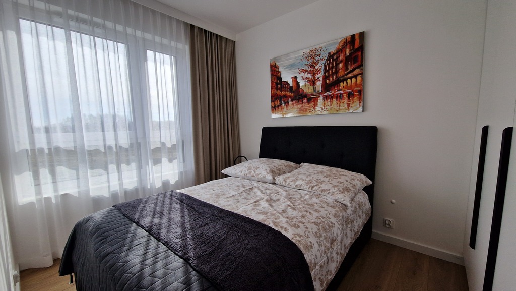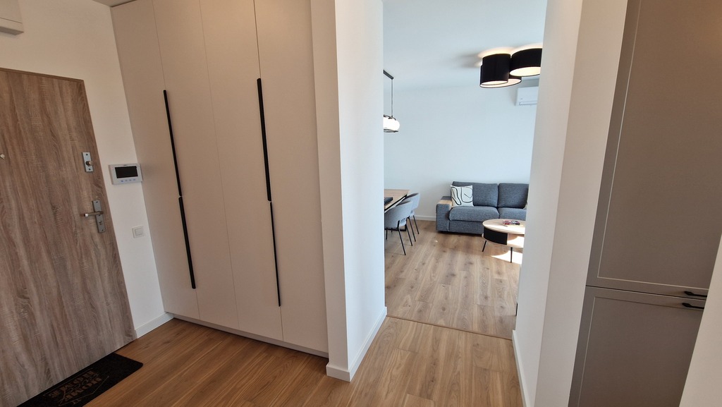 For rent a completely new and unused apartment in Warszewo. Live in a new apartment in the best district of Szczecin. Beautiful area – close to the Wkrzańska Forest, areas appreciated by residents for bike trips and walks. Housing estate from 2024 with numerous parking spaces for residents. The apartment on the area of 41.82 m2 and is fully furnished and equipped – ready to move in. The premises are located on the 1st floor, have a large sunny balcony (all windows facing south) and have air conditioning installed. Heating and hot water in the building from the city network. The area of the premises consists of the following rooms: – furnished living room 16m2 with air conditioning, exit to the balcony – bedroom 9m2 with a large wardrobe and a double bed – furnished kitchen 5.42m2 with a window, fully equipped (dishwasher, fridge, oven) – bathroom 4.8m2 with a shower cabin, washbasin, washer-dryer. – corridor 6.6m2 with a large built-in wardrobe to the ceiling The entire apartment is very tastefully finished in modern colors. Additionally, the tenant will have a storage room with an area of 3.56m2 on the same floor. Additional fees are: community rent with advances for water and heating (435.74) + electricity. Deposit 4000 PLN, minimum lease for one year. No pets. Available immediately We invite you and recommend.