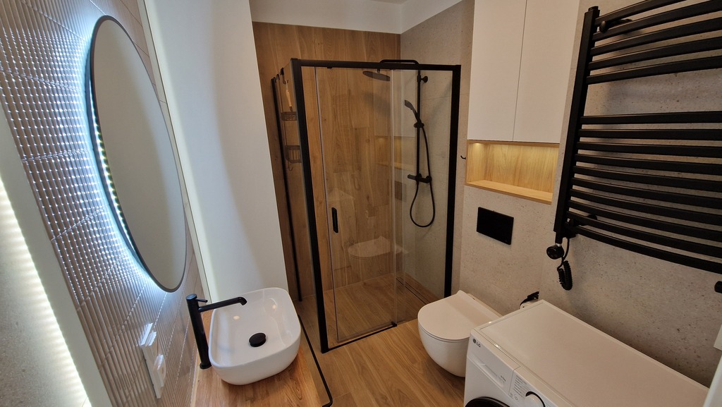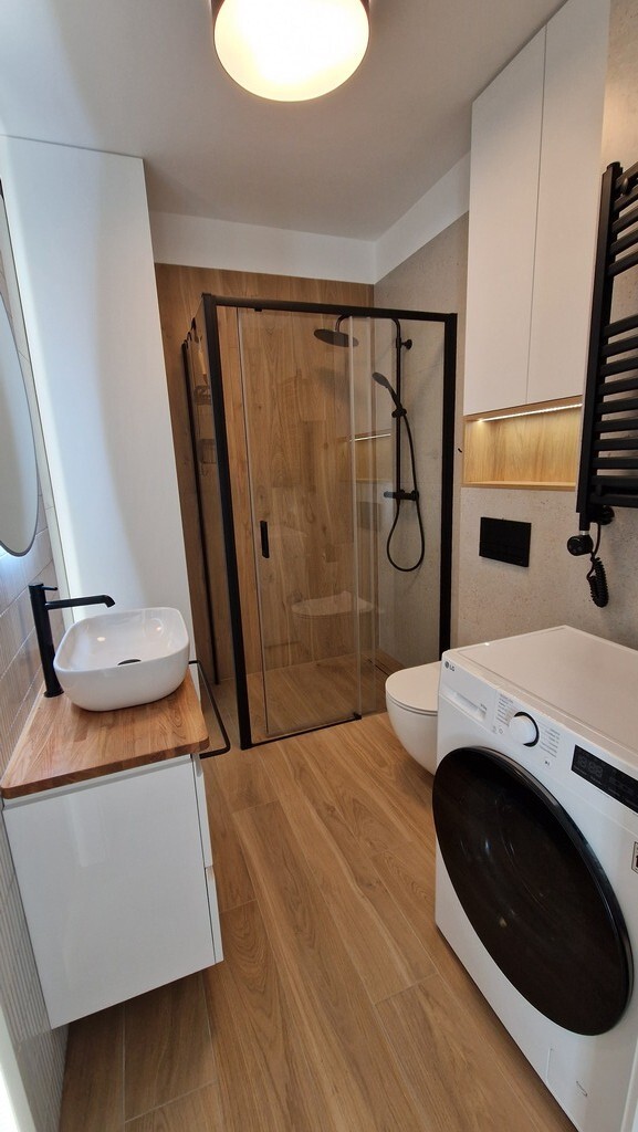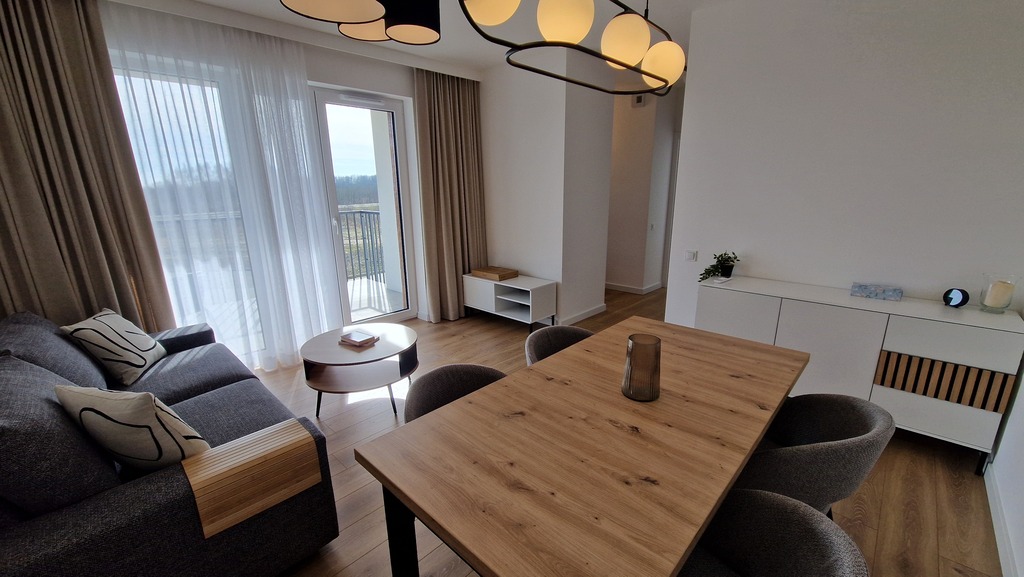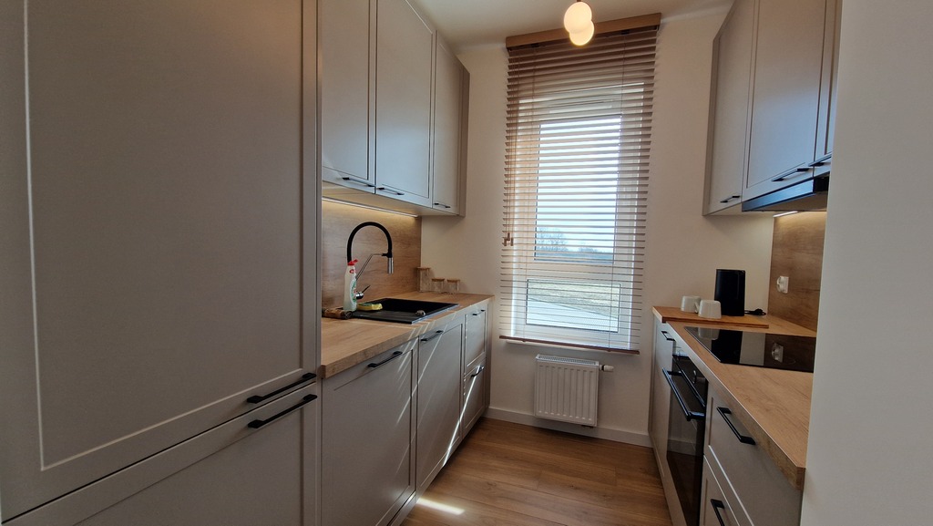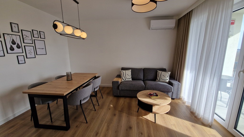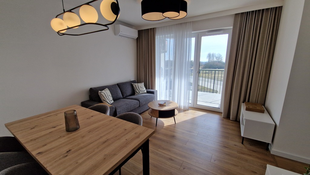 For rent a completely new and unused apartment in Warszewo. Live in a new apartment in the best district of Szczecin. Beautiful area – close to the Wkrzańska Forest, areas appreciated by residents for bike trips and walks. Housing estate from 2024 with numerous parking spaces for residents. The apartment on the area of 41.82 m2 and is fully furnished and equipped – ready to move in. The premises are located on the 1st floor, have a large sunny balcony (all windows facing south) and have air conditioning installed. Heating and hot water in the building from the city network. The area of the premises consists of the following rooms: – furnished living room 16m2 with air conditioning, exit to the balcony – bedroom 9m2 with a large wardrobe and a double bed – furnished kitchen 5.42m2 with a window, fully equipped (dishwasher, fridge, oven) – bathroom 4.8m2 with a shower cabin, washbasin, washer-dryer. – corridor 6.6m2 with a large built-in wardrobe to the ceiling The entire apartment is very tastefully finished in modern colors. Additionally, the tenant will have a storage room with an area of 3.56m2 on the same floor. Additional fees are: community rent with advances for water and heating (435.74) + electricity. Deposit 4000 PLN, minimum lease for one year. No pets. Available immediately We invite you and recommend.