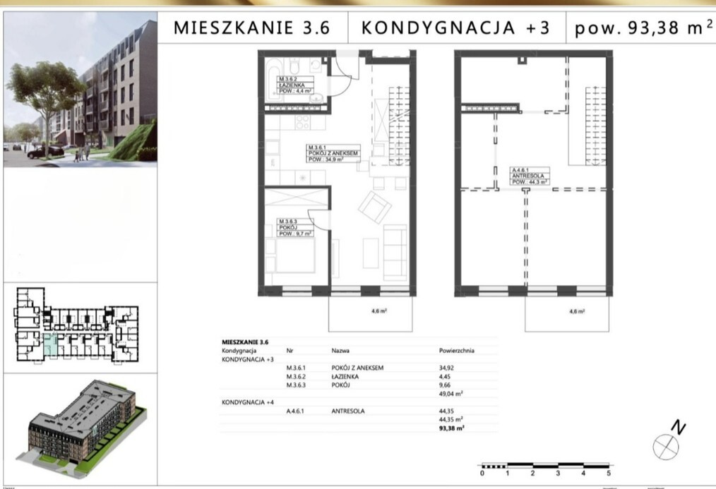 The total area of the level is 44.35 m², which together with the first level gives 93.38 m².