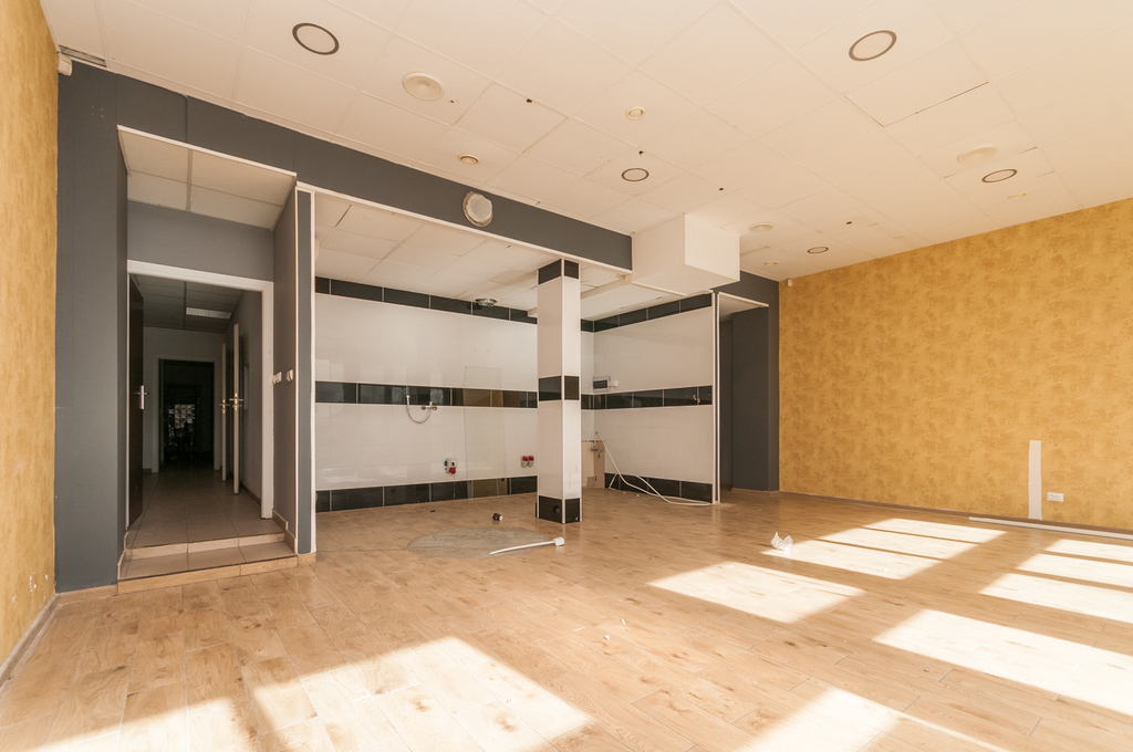 Sales room with dimensions of approx. 8.5 X 7.5 = 64 sq m, height over 3 m, suspended ceiling, tiles on the floor. In the kitchen area there are power sockets. There is a gas installation in the premises (gas furnace) but there is no gas connection in the main hall.