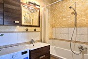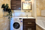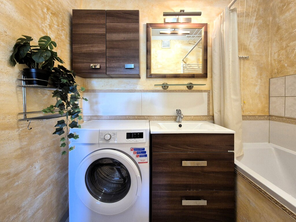 * bathroom with bathtub, sink and washing machine, separate toilet