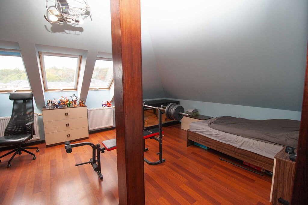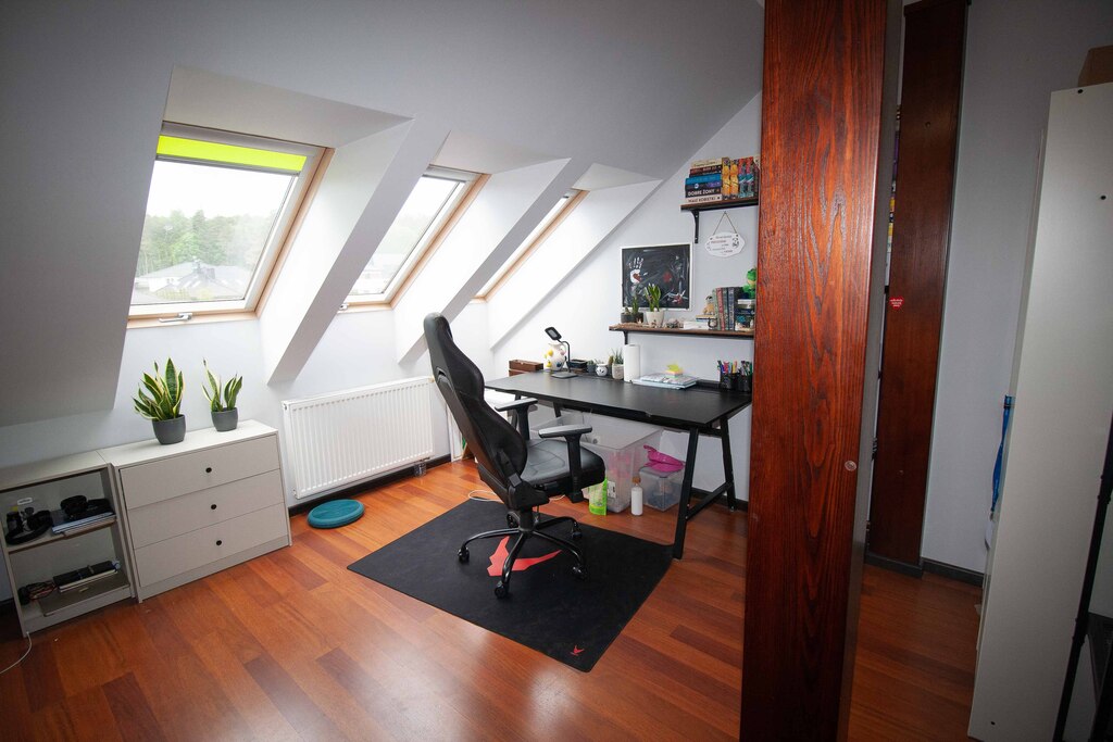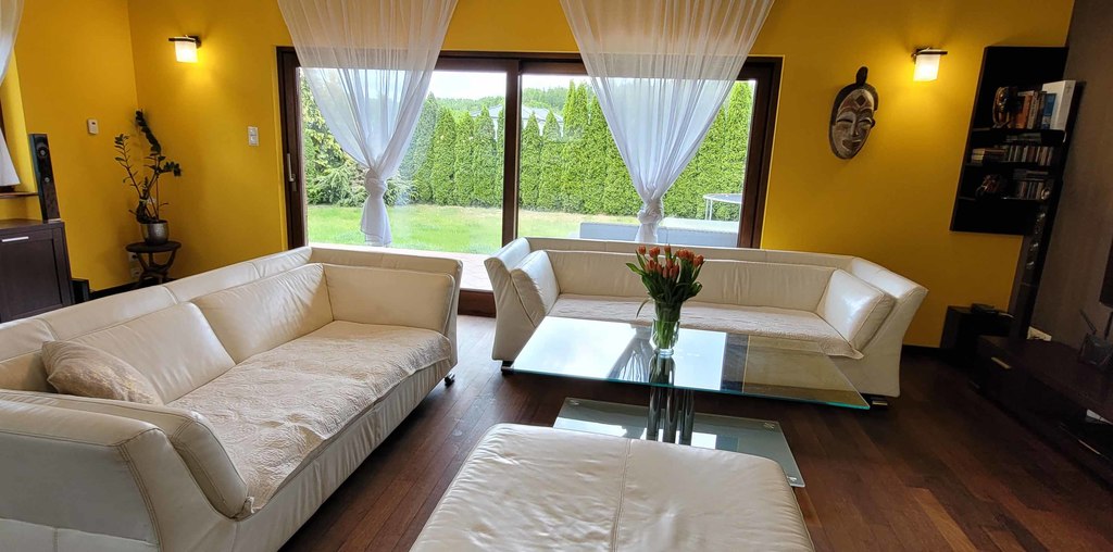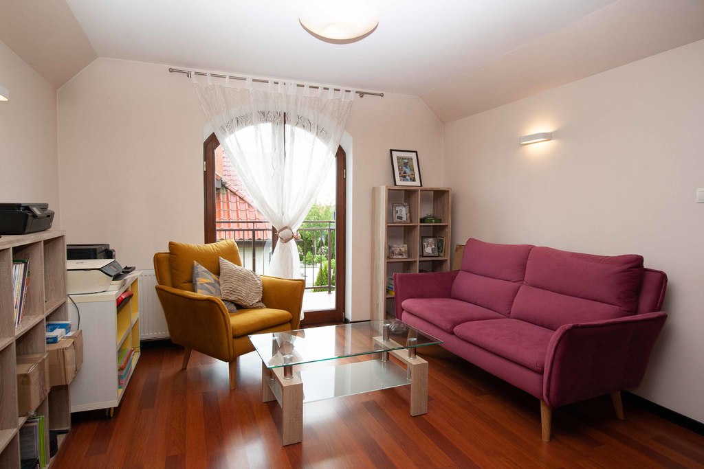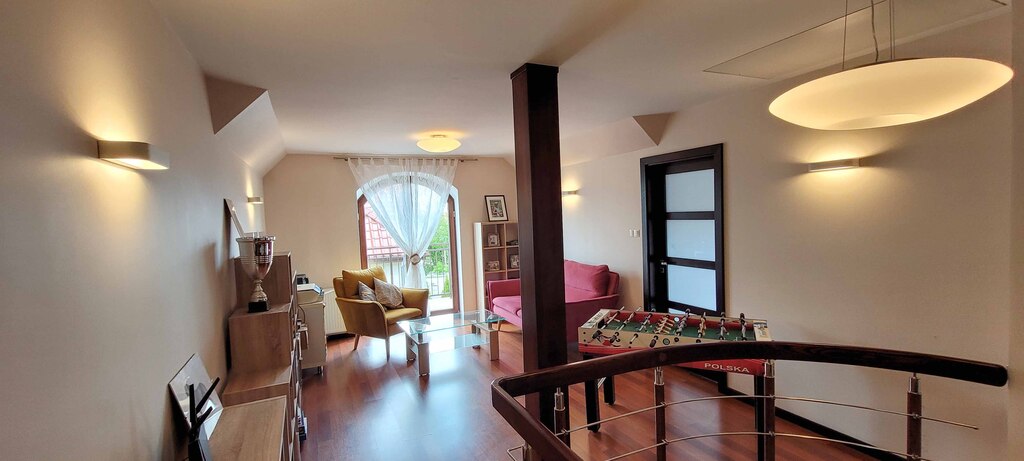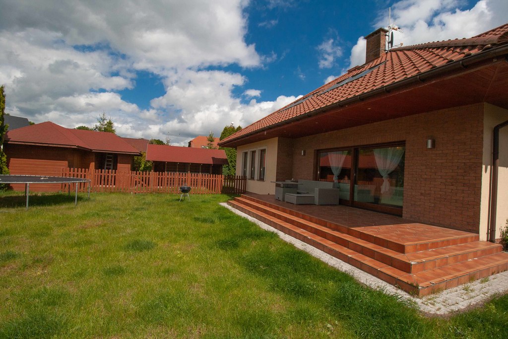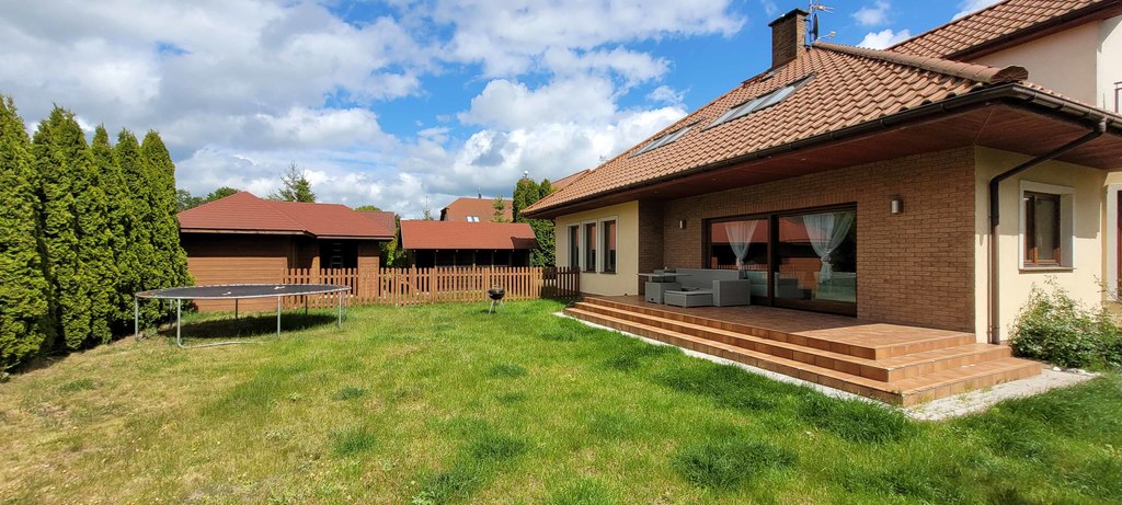 For sale a modern and spacious detached house with an area of 235 m², located on the border of the Warszewo and Osów districts – in one of the most prestigious and sought-after locations in Szczecin. The property is situated on a regular plot of 816 m², in the immediate vicinity of the Wkrzańska Forest, which guarantees residents peace, quiet and access to recreational and walking areas. Access to the property is provided by an asphalt road, with access to public transport (bus). The house is distinguished by its attractive, timeless architecture, multi-pitched roof and functional layout of rooms. The entrance to the property is located on the eastern side, while the garden part with a spacious terrace with an area of 30.3 m² is located on the western side, which ensures optimal lighting of the recreation area. The building has a two-car garage with an area of 36.36 m², and in addition, a driveway for two more cars was made in front of the house. The ground floor (162.43 m²) is a representative and at the same time functional living area of the house. It contains: a vestibule (5.48 m²), a hall (10.15 m²), a spacious kitchen (12.21 m²) with a practical pantry (2.5 m²), a laundry room with a boiler room (7.22 m²), a toilet (1.22 m²) and a comfortable guest room (20.51 m²) with a private bathroom (8.54 m²). The living area also includes a living room with a fireplace, from which there is an exit to the terrace and further to the garden. The fireplace is prepared for the installation of a water jacket. Water underfloor heating has been installed throughout the ground floor and in the bathrooms on both floors. The floors are covered with stoneware and exotic merbau wood. The walls are smoothed and painted in light, neutral tones. Elegant ash stairs lead to the first floor. There is a hall with access to the balcony (11 m²), three well-arranged bedrooms (16 m², 14 m², 13 m²), a comfortable bathroom with a bathtub and shower (6.9 m²) and a practical wardrobe (1.5 m²). Additionally, there is an attic above the first floor – a utility room with an area of 19 m², ideal for storage. The property is equipped with a modern, two-function gas boiler with a Buderus tank. A central vacuum cleaner system is distributed throughout the house. Triple-glazed wooden windows provide excellent thermal and acoustic insulation. Internal doors are made of solid ash. Fiber optics has been brought into the building. The plot area has been developed with attention to aesthetics and functionality – a lawn has been arranged, and a gazebo has been built as a utility room. The whole creates a coherent, comfortable and ready-to-move-in house of a high standard, ideal for people looking for a modern property in a green, prestigious part of the city.