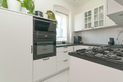 Bright kitchen with built-in furniture of good size, equipped with household appliances – fridge-freezer, dishwasher, microwave, oven, gas hob.