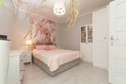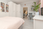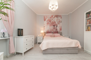 Two bright rooms in a walk-through layout – floor panels, smooth painted walls + wallpaper motif on the wall. Large comfortable bedroom with a double bed, a small desk for work and spacious wardrobes.