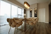 The interior design embraces a modern glamour aesthetic with a touch of art déco – featuring velvet fabrics, golden accents, natural wood flooring, designer lighting, and elegant wallpaper. Every detail has been carefully curated and placed with purpose, creating a cohesive and luxurious ambiance.