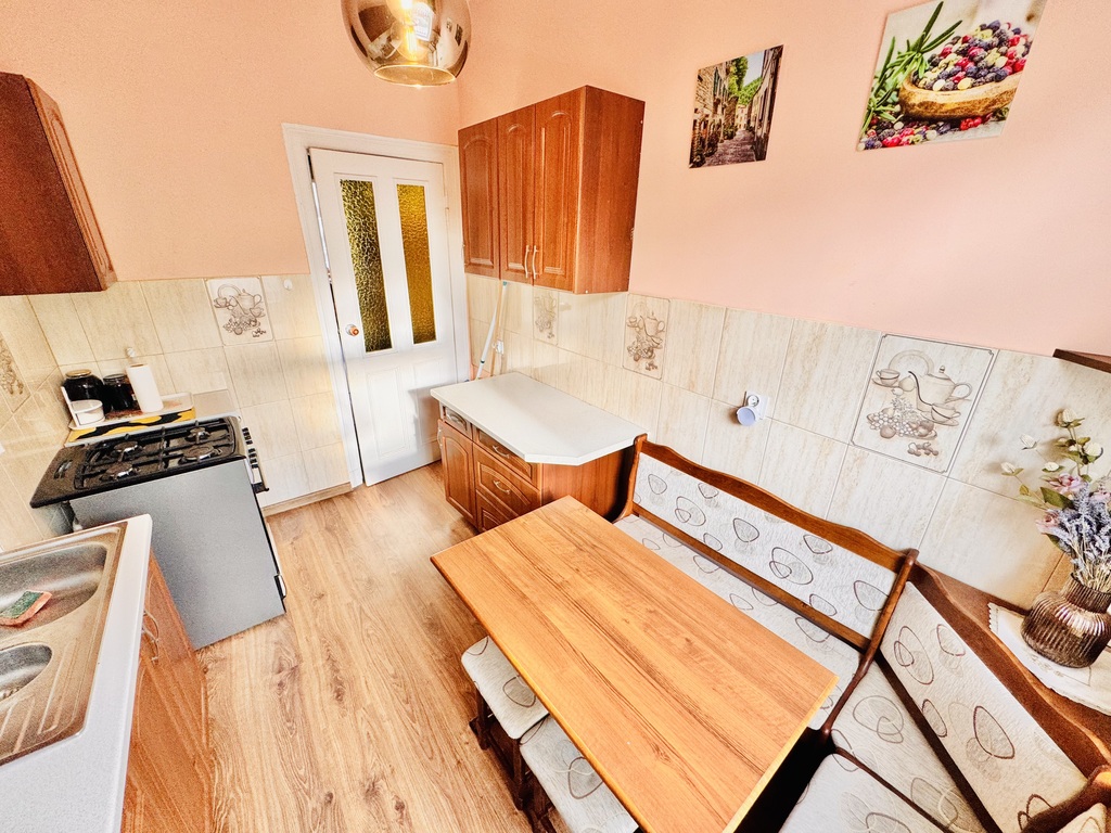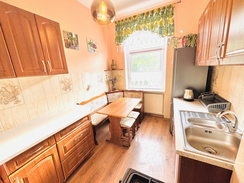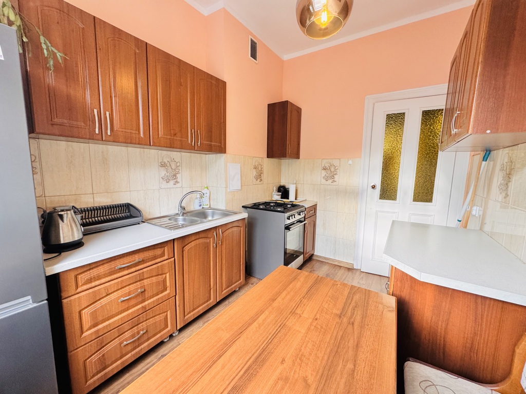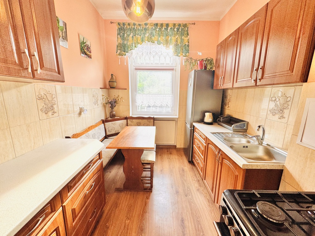 All sunny rooms feature PVC windows. The kitchen is equipped with built-in furniture and appliances.