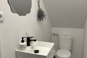 A modernized single-family home in a rustic style is for sale. Located in the quiet village of Bismark, just 4 km from the Polish border in Lubieszyn, it is surrounded by a nature reserve, guaranteeing peace, tranquility, and stunning views. For this reason, the surrounding area will never be developed. This wooden building, built in 1961, was thoroughly renovated in 2024. Beneath the entire ground floor (70 sq m) is a brick cellar with a laundry room and plenty of space for hobby rooms. The house also includes a 1600 sq m plot with a garden, which includes fruit trees (apple, cherry, walnut, etc.). There is also an outbuilding on the plot that can be used as a garage/workshop/lumber yard, etc. The layout: on the ground floor there is a spacious vestibule, a bathroom with a shower (underfloor heating), a kitchen, a bedroom, and a spacious living room. Upstairs, you'll find two bedrooms, a powder room, and a utility room that can be used as a dressing room. The rooms are spacious and bright, and the house has a unique atmosphere. The floors are laminate and tiled, and the bedrooms are carpeted. Bismark is a charming town, just a five-minute drive from both the shops on the Polish side (Biedronka, Netto) and the town of Locknitz, with its infrastructure and beautiful lake. A drive to the center of Szczecin takes about 25 minutes. This house is ideal for those who love contact with nature and value a sense of privacy and peace, while remaining close to city life. The total area of the house is 140 m2, with a usable area of 120 m2.