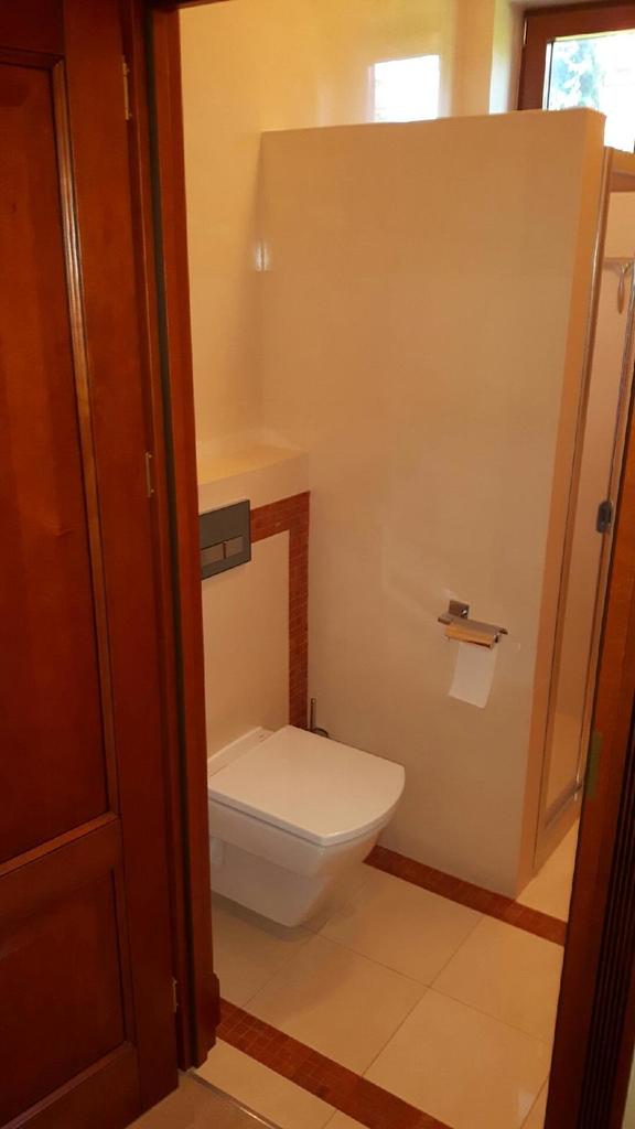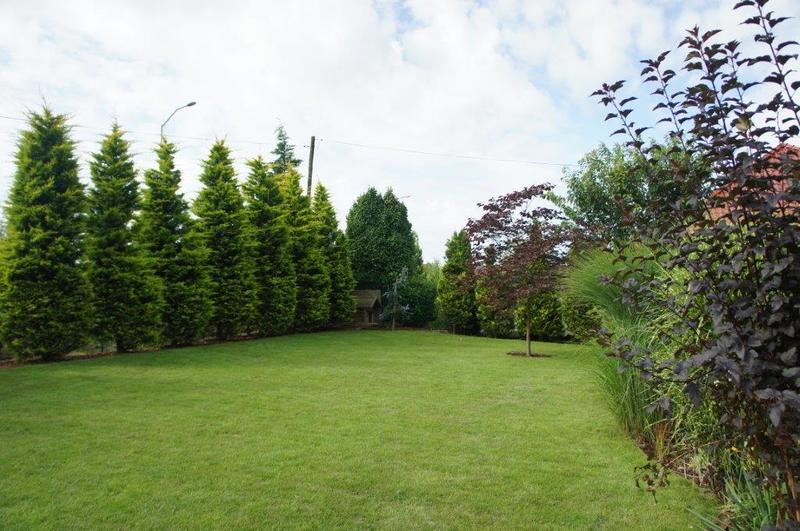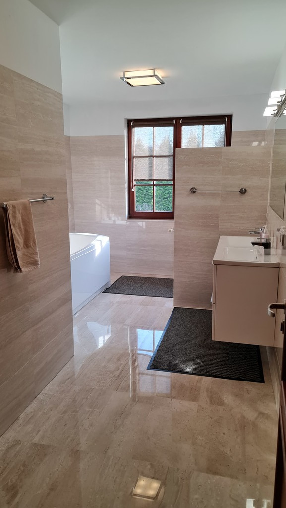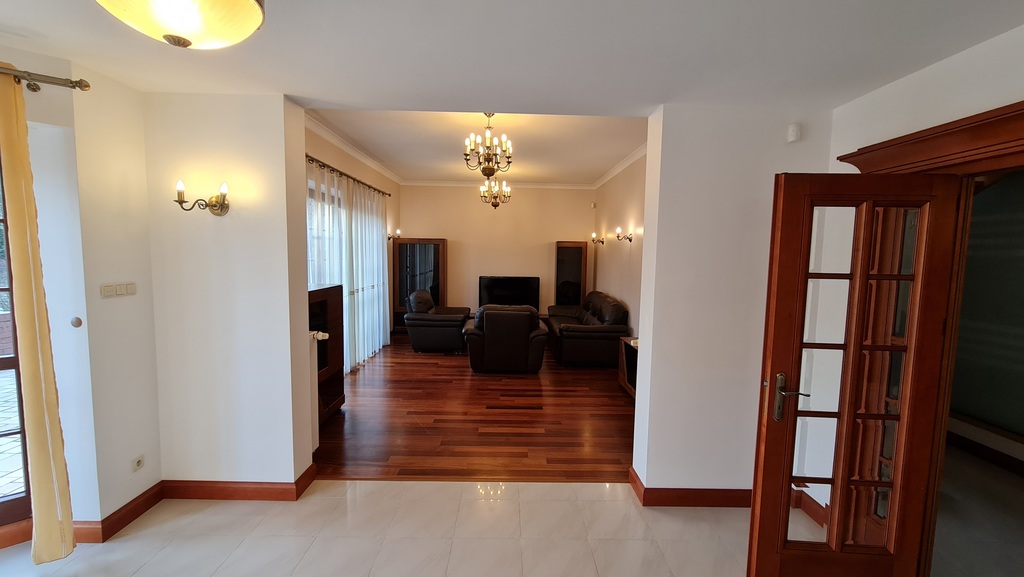 A new house located on a slight hill, among other single-family houses. Access to the house is a cul-de-sac with an asphalt surface. The ground floor of the house is made of lime-sand brick, the first floor is made of porotherm, insulated with a 15 cm layer of mineral wool, with a decorative façade layer on the ground floor made of clinker brick. Monolithic reinforced concrete ceilings, cornice – eaves made of decorative prefabricated reinforced concrete slabs. The ceiling above the first floor is insulated with a 25 cm layer of mineral wool, covered with a plank floor, and the attic is above. Roof truss covered with ceramic tiles. Mahogany windows with electric anti-burglary blinds, clock-controlled (two circuits), internal window sills made of mahogany wood, 6 cm thick. There is an alarm system in the building (including window sensors). Stairs to the treatment floor, comfortable, made of beech wood. On the north side, there is a very nice brick fence made of clinker bricks with decorative wrought iron grates, and an electric and remote-controlled entrance gate. The layout of the house is very functional. On the ground floor: on the south side, a living room of 26.12 m2 (with the possibility of connecting a fireplace) connected through a large opening to the dining room of 15 m2, then to the kitchen of 10.51 m2. From the living room and dining room you can access the terrace. On the ground floor, there are 3 separate rooms with a toilet (with a total area of 53.7 m2) with a separate entrance from the outside, and the possibility of access to the rest of the ground floor. Possibility of separating a separate premises with a separate entrance. This part has a separate electrical installation with a meter. Other rooms on the ground floor: hall, dressing room 15.13 m2, bathroom with shower 4.19 m2, boiler room with laundry room 6.64 m2, double garage 37.2 m2. On the first floor: corridor, two rooms with areas: 18.67 m2 and 18.25 m2 (the one with a wardrobe 5.27 m2), guest room 14.12 m2, bedroom 14.92 m2 with a separate bathroom 5.73 m2 and wardrobe 3.37 m2, shared bathroom 12.55 m2. On the ground floor, polished stoneware on an area of approx. 90 m2, tiles in the bathroom, toilet and kitchen (a strip above the countertop), painted rooms: kitchen with dining room, dressing room, hall, two rooms in a separate part. Modern, very economical heating – condensing gas furnace with hot water tank, automatically cleaning water filter. Areas: first floor 103.8 m2, ground floor 157.5 m2, garage 37.2 m2. The total area of the house is 298.5 m2 and it is possible to easily divide the house into two or three apartments. I recommend and invite you to such a unique house!!!