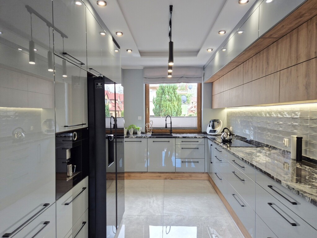 – open kitchen with a large window, equipped with high-class Bosch appliances under warranty (double-door refrigerator with freezer, pyrolytic oven, built-in microwave, dishwasher, 90 cm induction hob, hood, granite under-counter sink) and a granite countertop