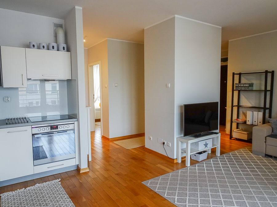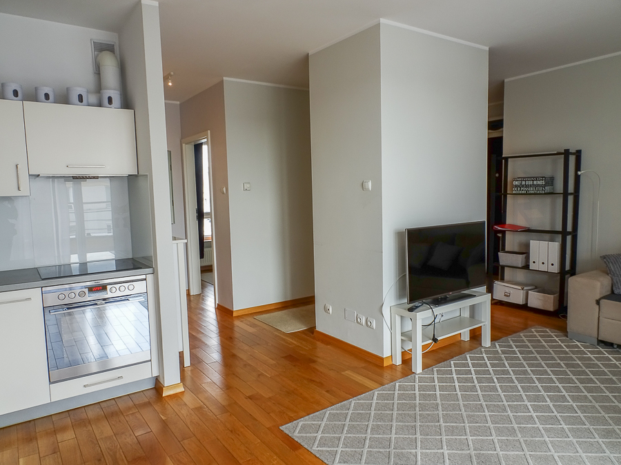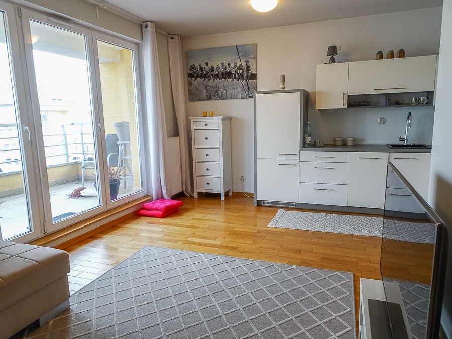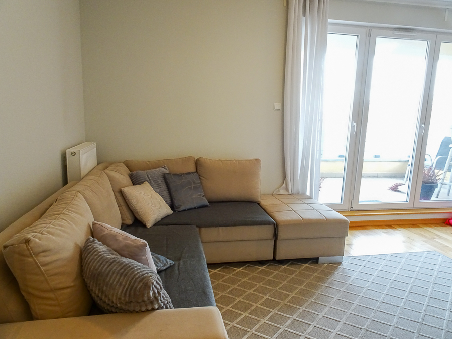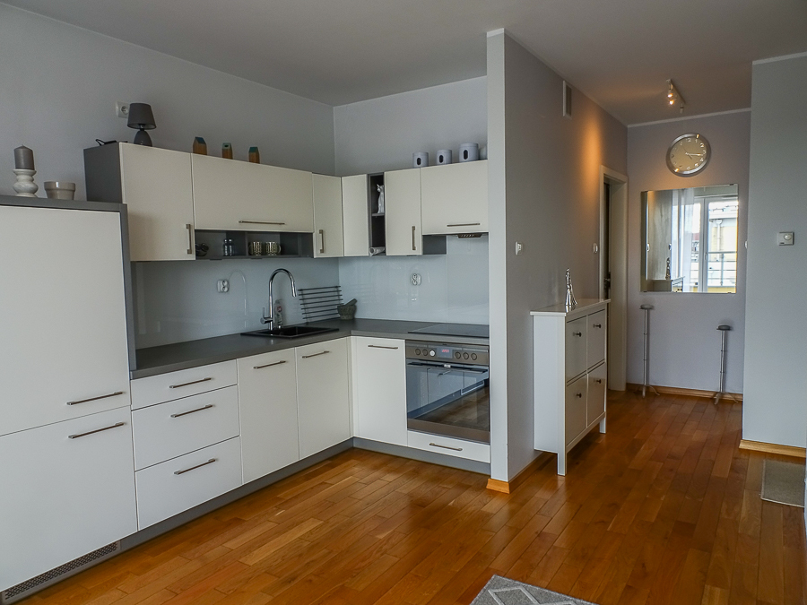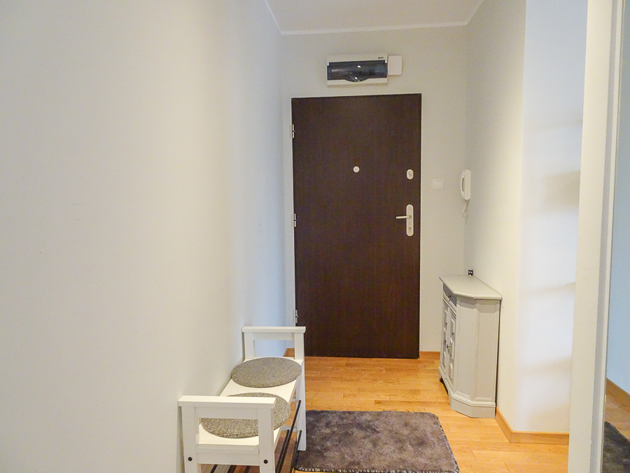 For rent in a beautiful neighborhood near the tram terminus, this cozy, furnished and equipped 2-room apartment (50 m²) offers a panoramic terrace. A parking space in the underground garage and a 3.8 m² storage unit are included. The building, with an elevator, was built in 2012 and is constructed of Porotherm. It's located on the 5th floor, top floor. The apartment rent is PLN 2,800, the parking space and storage unit are PLN 400, and utilities are PLN 500 (includes a prepayment for cold water and garbage collection billed every 6 months). Heating and hot water are also included, along with electricity (approximately PLN 500). The apartment is in a very good standard. APARTMENT DESCRIPTION: A living room with a kitchenette, totaling 23.5 m², opens onto a 10 m² terrace on the east side with a beautiful view. The room features a corner sofa, a TV, chests of drawers, built-in kitchen units, and appliances: dishwasher, oven, electric hob, sink, dishes, and pots. The 13.1 m² bedroom has a double bed, a built-in three-door wardrobe, a chest of drawers, and bedside tables. The bathroom has a shower, washing machine, cabinet, shared toilet, and a window. The 7 m² hall has a cabinet. Security deposit: PLN 4,500. Highly recommended.