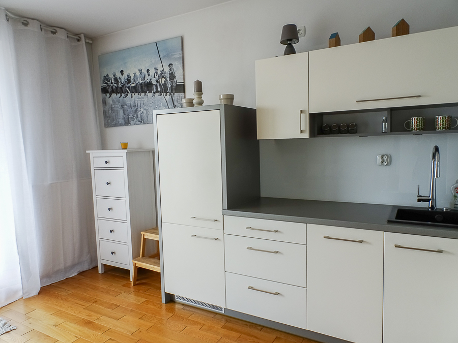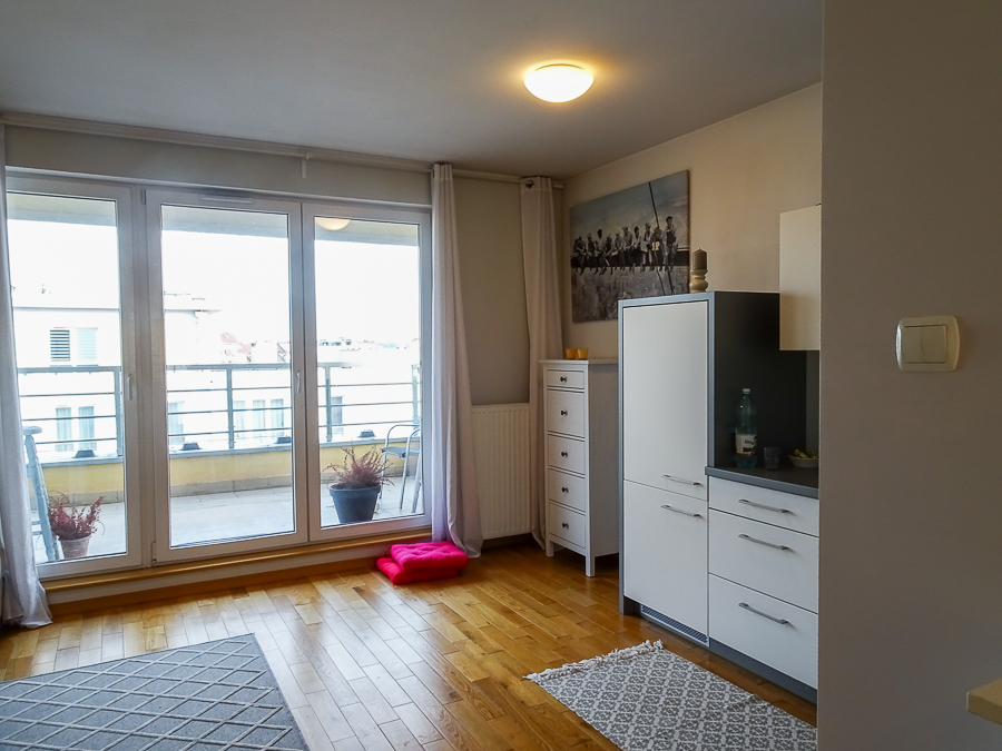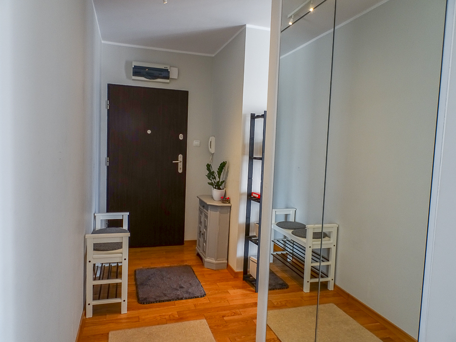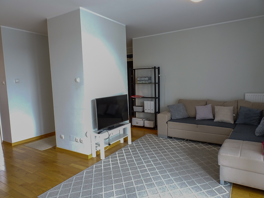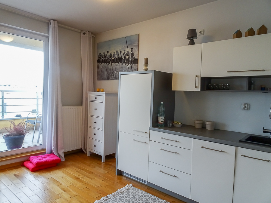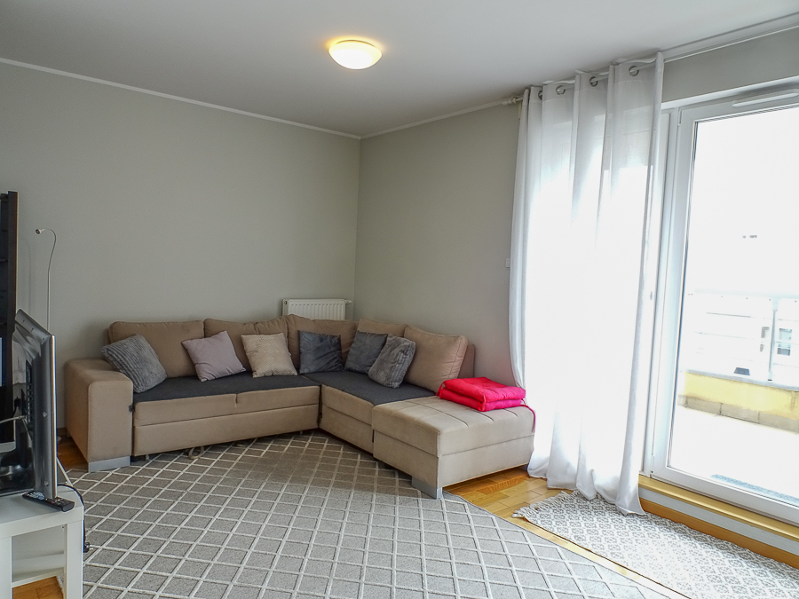 For rent in a beautiful neighborhood near the tram terminus, this cozy, furnished and equipped 2-room apartment (50 m²) offers a panoramic terrace. A parking space in the underground garage and a 3.8 m² storage unit are included. The building, with an elevator, was built in 2012 and is constructed of Porotherm. It's located on the 5th floor, top floor. The apartment rent is PLN 2,800, the parking space and storage unit are PLN 400, and utilities are PLN 500 (includes a prepayment for cold water and garbage collection billed every 6 months). Heating and hot water are also included, along with electricity (approximately PLN 500). The apartment is in a very good standard. APARTMENT DESCRIPTION: A living room with a kitchenette, totaling 23.5 m², opens onto a 10 m² terrace on the east side with a beautiful view. The room features a corner sofa, a TV, chests of drawers, built-in kitchen units, and appliances: dishwasher, oven, electric hob, sink, dishes, and pots. The 13.1 m² bedroom has a double bed, a built-in three-door wardrobe, a chest of drawers, and bedside tables. The bathroom has a shower, washing machine, cabinet, shared toilet, and a window. The 7 m² hall has a cabinet. Security deposit: PLN 4,500. Highly recommended.