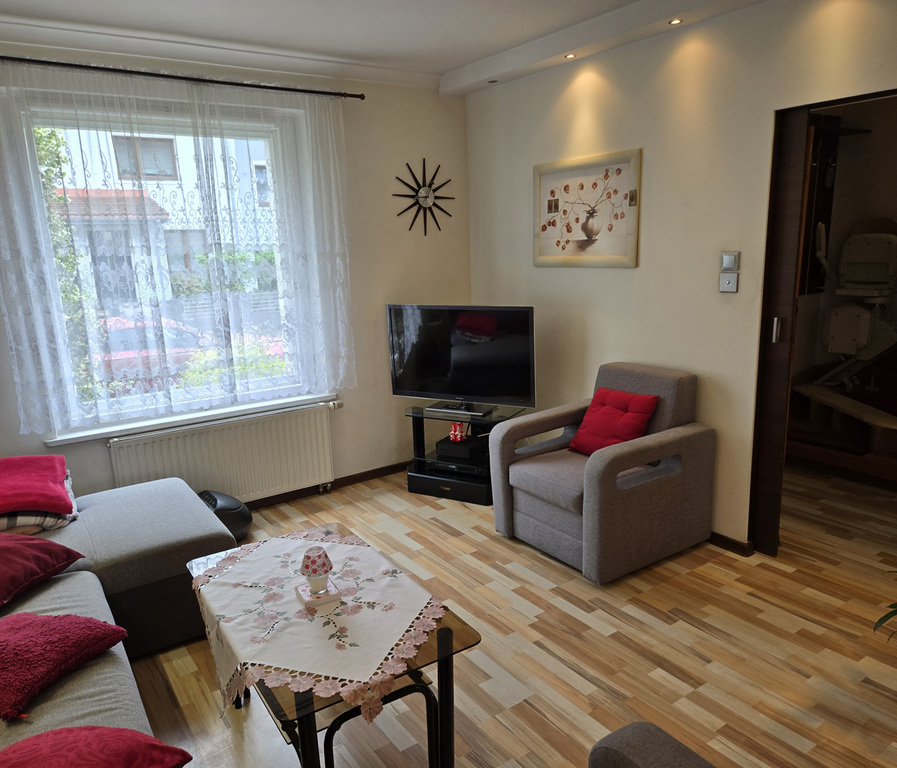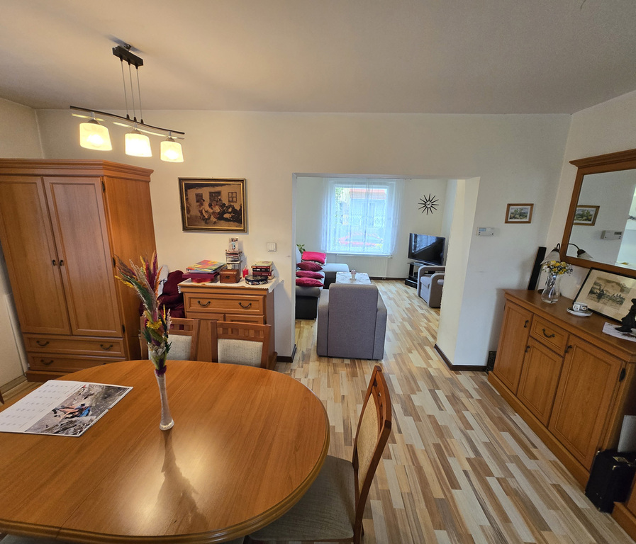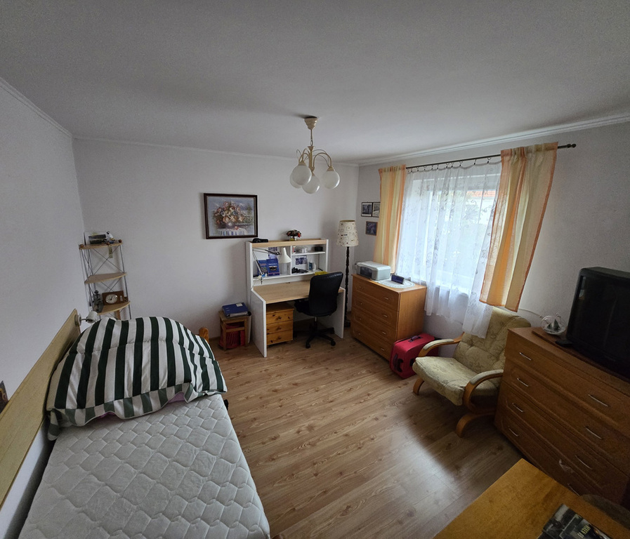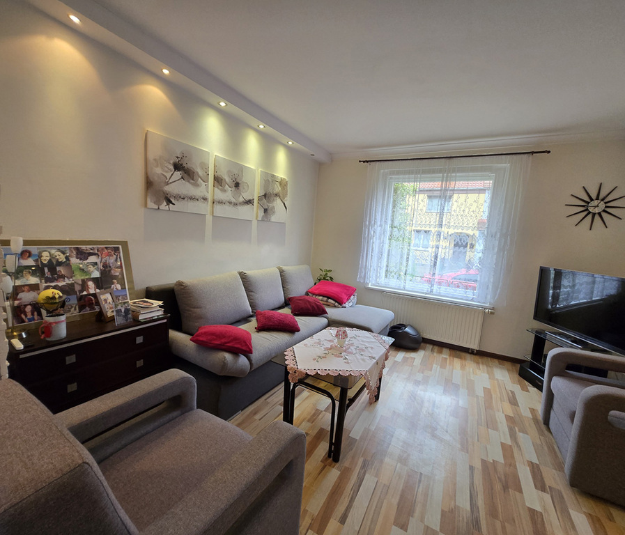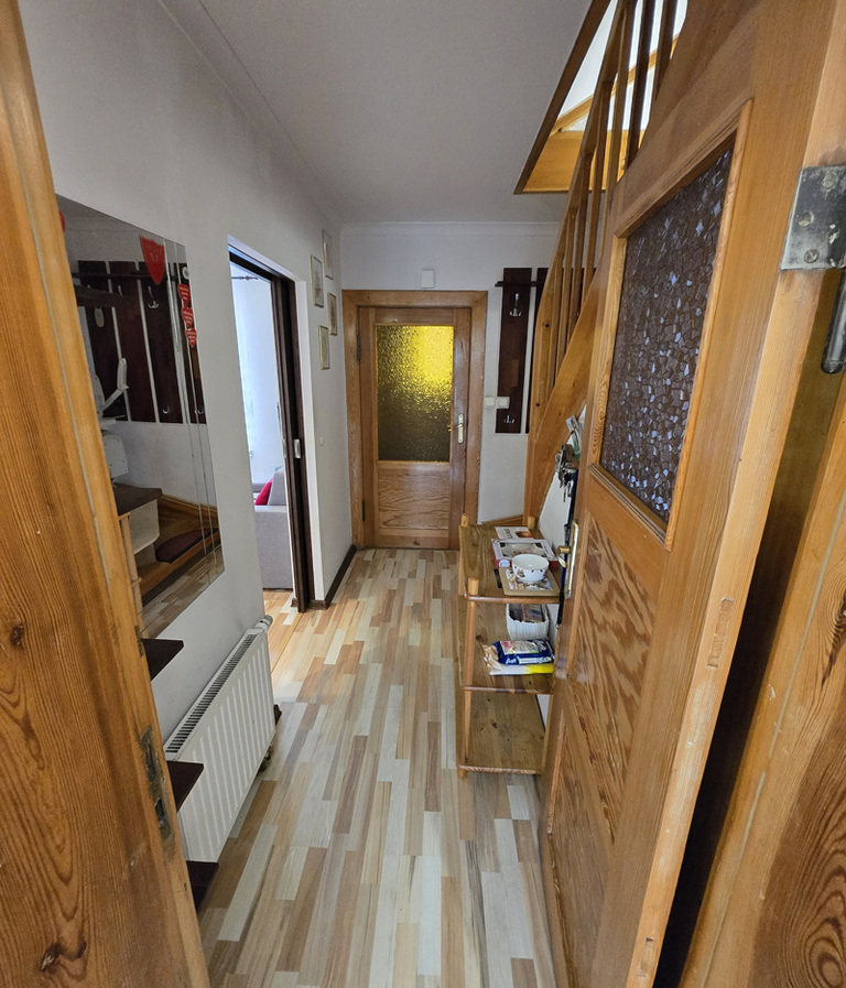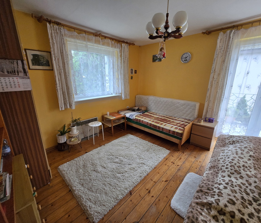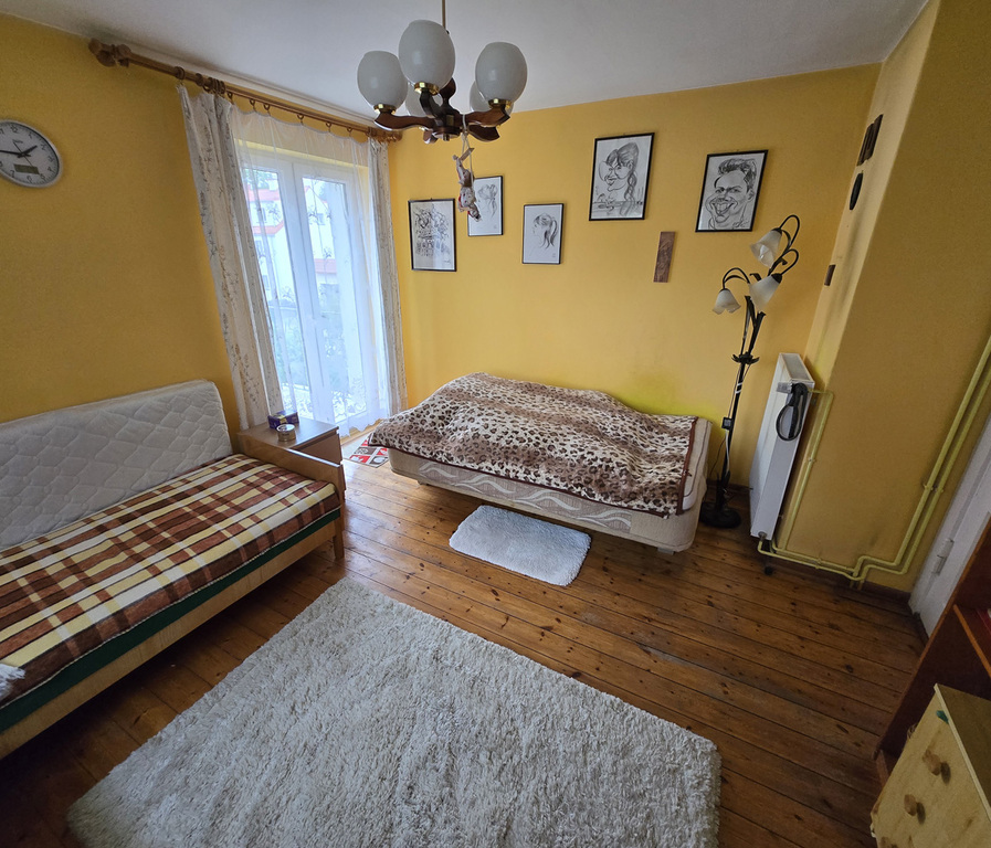 Sunny. Semi-detached house with a large garden, courtyard, and separate garage. On the plot: 2 parking spaces + various ornamental plantings. Area: 104 m2 (plus basement of approx. 30 m2). GROUND FLOOR: 2 spacious living rooms (recently laid laminate flooring) + large windows, bright kitchen (new: IKEA furniture, induction hob, and fridge) + access to the terrace and garden. In the vestibule, access to a small toilet. Anti-burglary roller shutter on the patio doors to the garden. FIRST FLOOR: 3 rooms and a bathroom with a shower. One room has access to a large balcony (the balcony tiles were laid in 2008). ATTIC: hall + 1 fully habitable room – insulated: room partially finished with wood paneling (ideal for young people) + hall and 2 built-in storage units. BASEMENT: 3 dry rooms requiring finishing: a pantry, laundry room, and boiler room with a new Vaillant atmoTec boiler. The house has undergone a plumbing overhaul, 4 of the 5 windows on the first floor, and both patio doors have been replaced with new PVC ones. The garage (brick, 19 m²) is separate from the building, with electricity and a remote-controlled automatic gate. The entrance gate is sliding. Ready for occupancy within 7 days of payment.