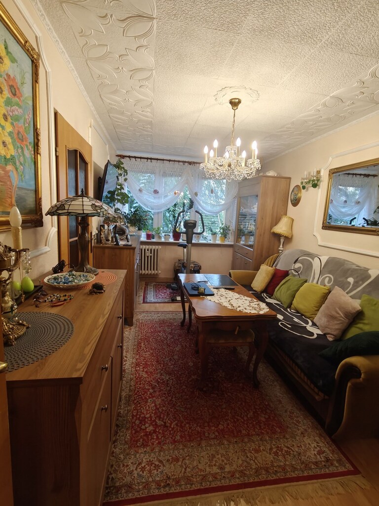 Pomorzany, Legnicka Street. Located in a low-rise, insulated building surrounded by greenery and numerous parking spaces, this elevated ground floor apartment has an area of 54.62 m² and a basement of 59.48 m². It comprises four rooms – 15, 10, 8, and 7 m², with the 8 m² room accessed from the 15 m² living room (these rooms can be combined to form one large 23 m² room). The remaining rooms are spacious. There is a 9 m² kitchen with a window, a gas stove, and kitchen units. A 4 m² bathroom with a bathtub and shower screen, finished with tiles and terracotta. A spacious L-shaped hallway features laminate flooring in the rooms, and terracotta in the kitchen and hallway. All windows are PVC. Heating and hot water are provided by municipal heating. The monthly rent to the property manager is 800 PLN, including advance payments for hot and cold water and heating. The apartment is very warm, beautifully located, with plenty of greenery nearby. Annual heating costs are reimbursed at approximately 1000 PLN. A large basement with a window belongs to the apartment. I highly recommend it and invite you to a viewing.