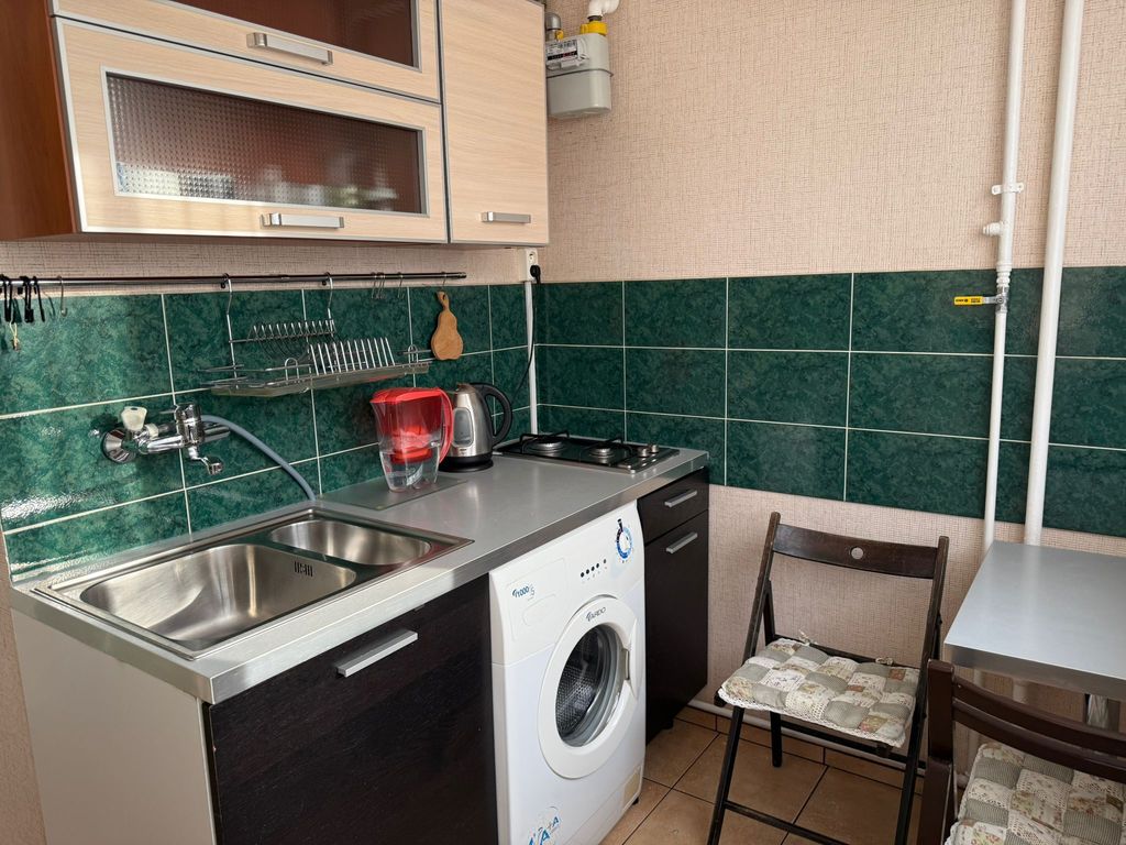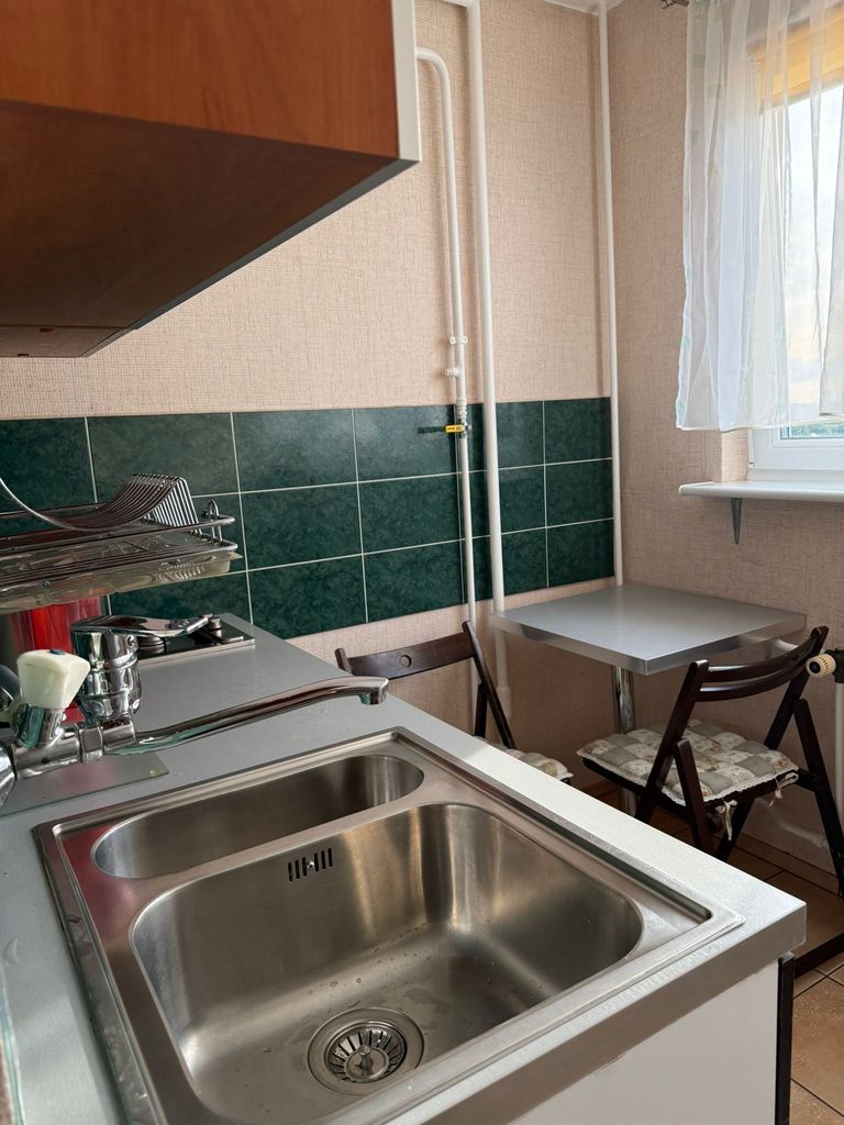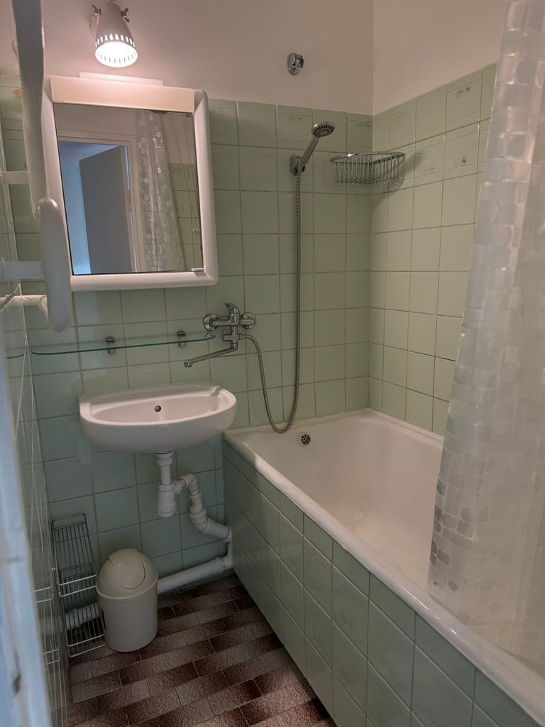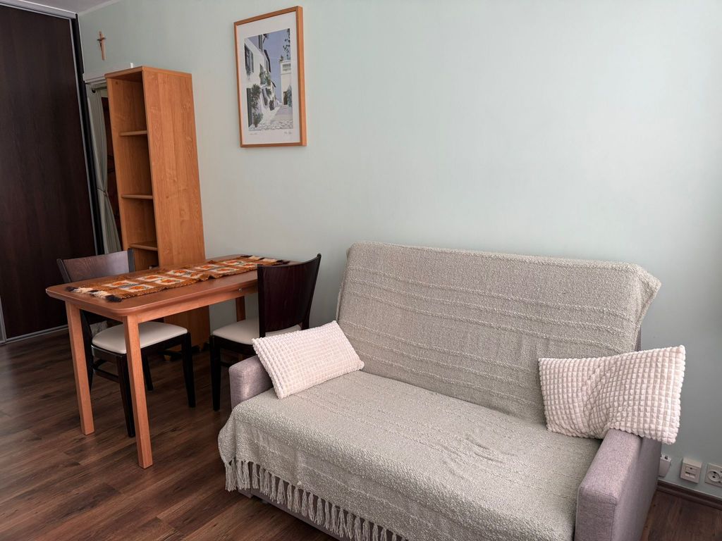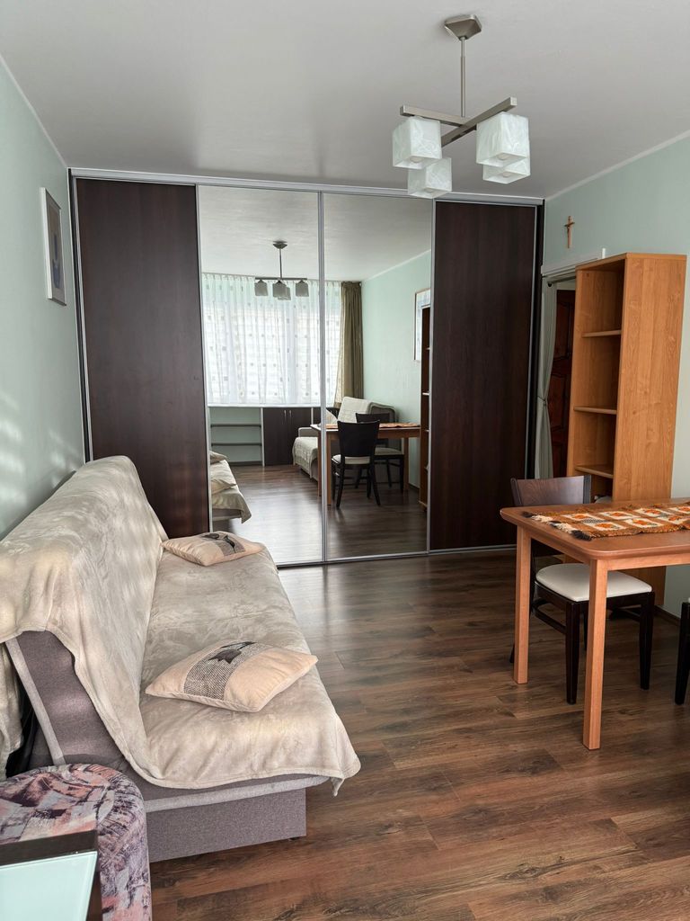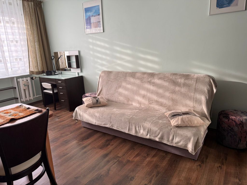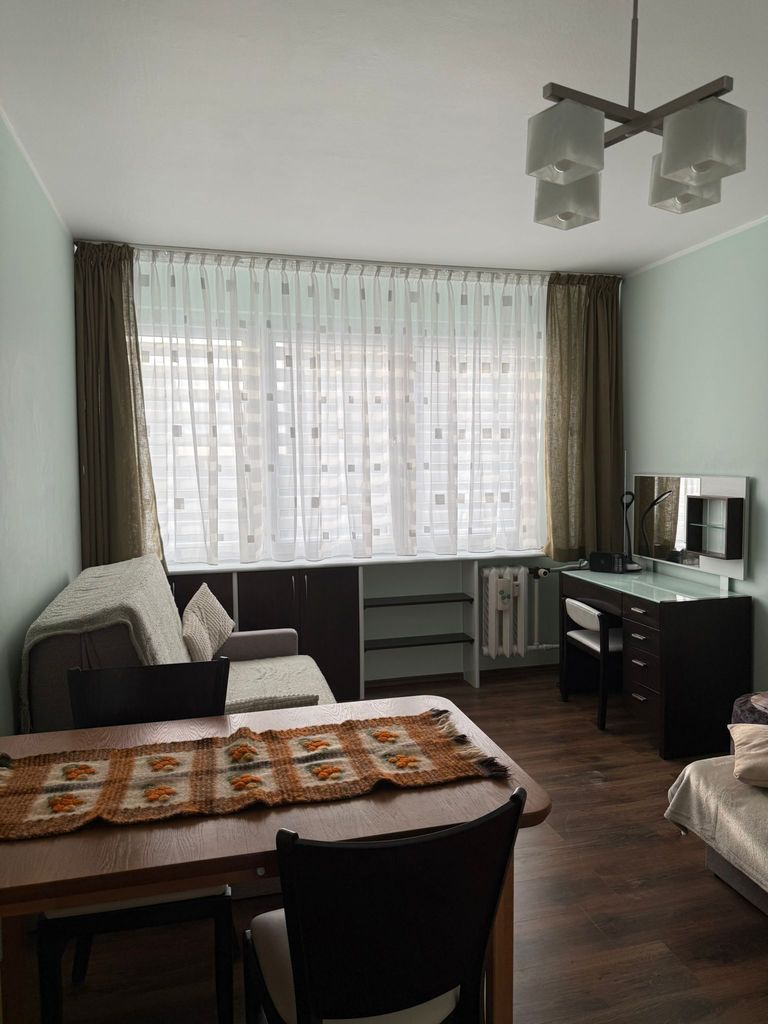 The room features two fold-out beds, a table with chairs, a bookshelf, a wardrobe, and a dressing table. The kitchen is equipped with a large refrigerator, washing machine, kitchen furniture, a gas stove, a microwave, cutlery, dishes, and pots. There’s a bathroom with a bathtub and a separate toilet. The apartment has a basement. It’s very clean and well-maintained, warm, and bright. Low maintenance costs make it ideal for students, couples, or working professionals.
