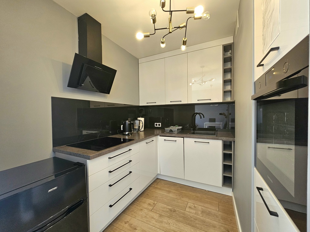 • Layout: bright living room with seating and dining area, separate bedroom, kitchen with built-in furniture and household appliances, bathroom with shower, wardrobe,