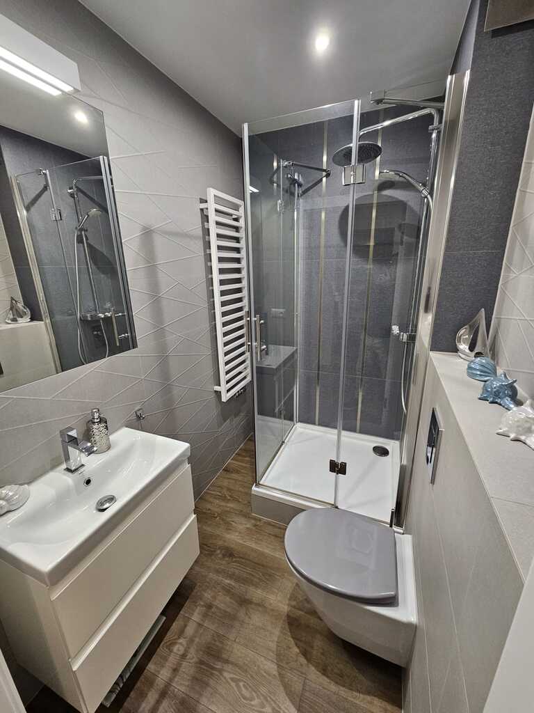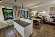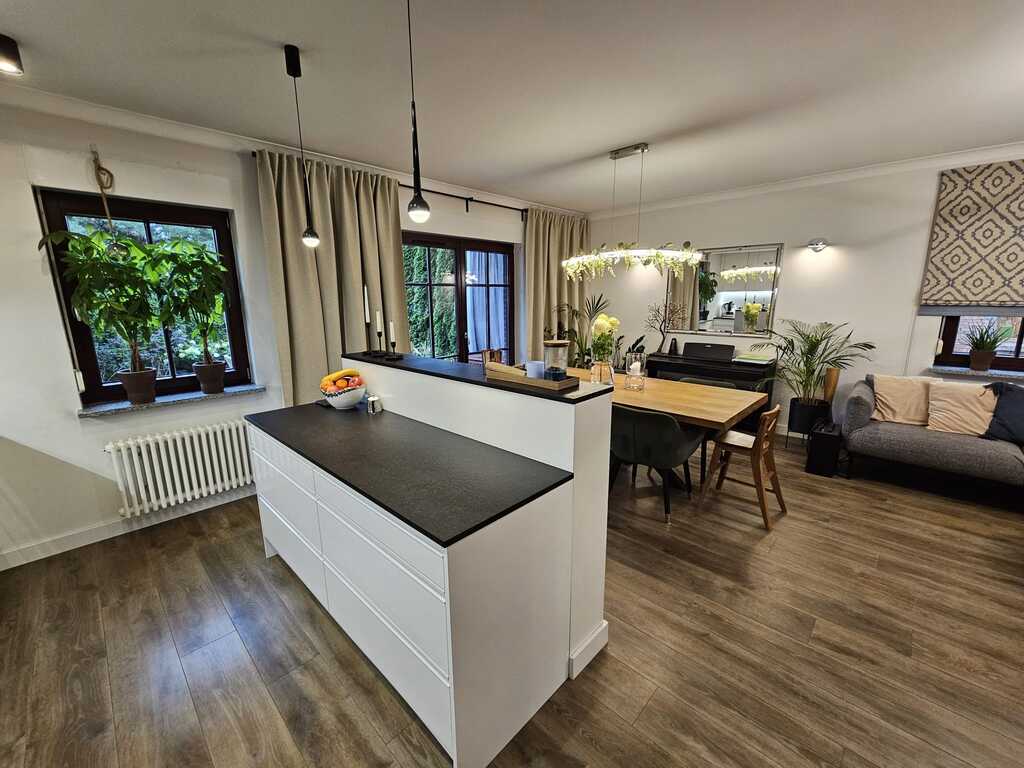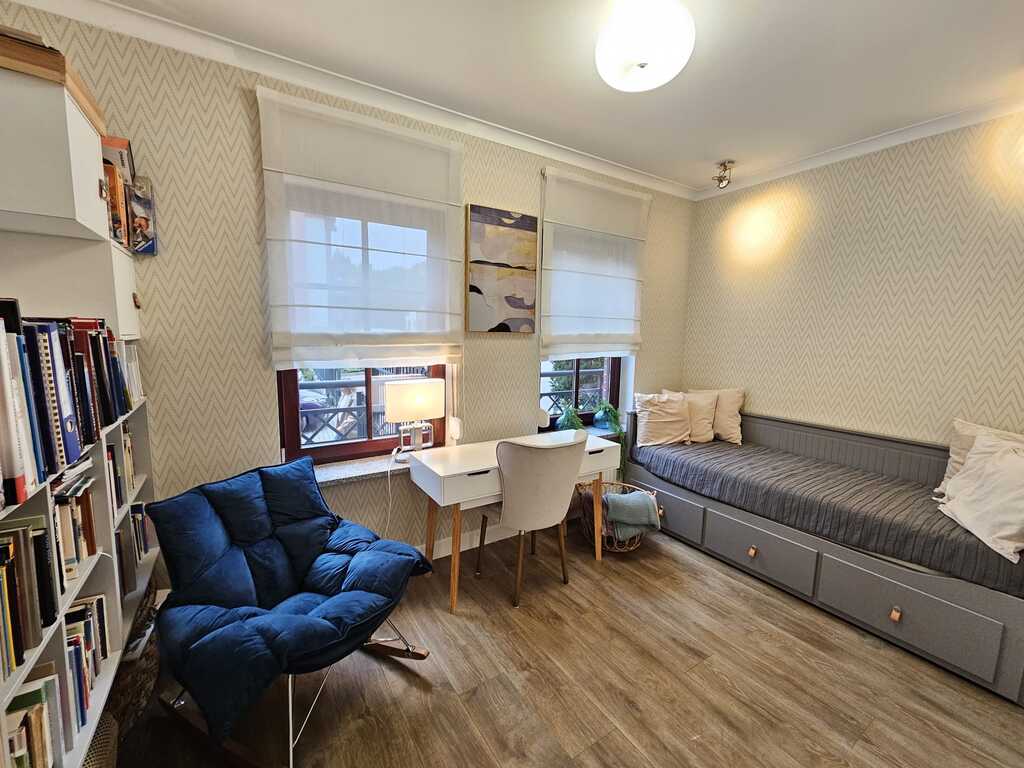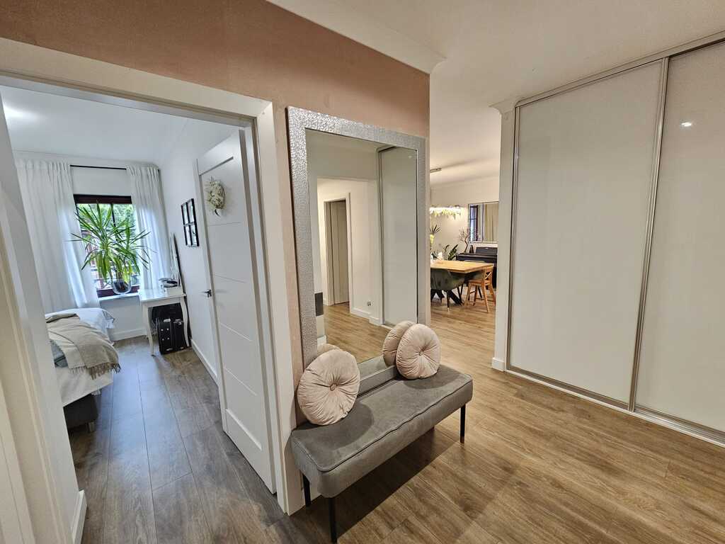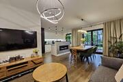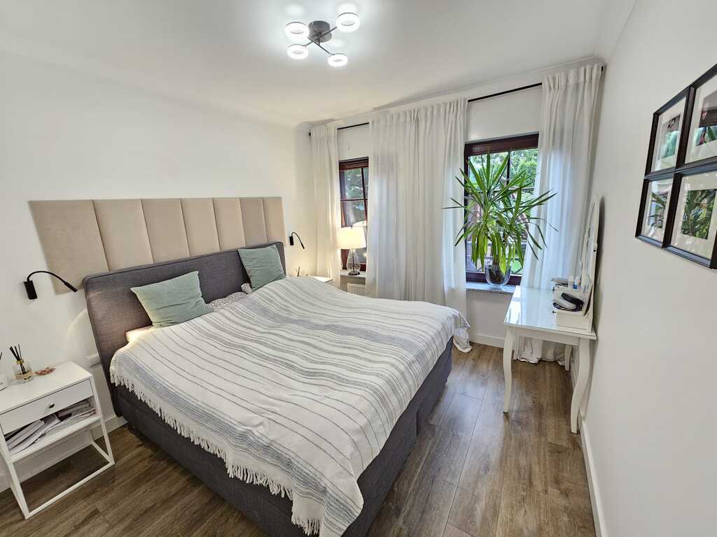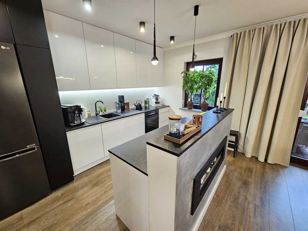 We offer you a sunny, tastefully furnished apartment located in the gated, monitored Garden House Apartments complex in Warsaw. This two-story apartment building with interesting architecture was built in 2009. A garage space is available for an additional PLN 65,000 (accessible via a staircase in the second building) and a 6.4m² storage unit for an additional PLN 25,000. The apartment, including the garage space and storage unit, costs PLN 1,288,000. This spacious apartment was created by combining two apartments, each with an area of 58.33m² and 41.89m². The change took place in 2019, when the apartment underwent a complete renovation. This spacious and well-arranged apartment, with a total area of 100.22 m², comprises a living room with a 35.5 m² kitchenette, three bedrooms (14.9 m², 11.6 m², and 11.3 m²), two bathrooms (4.5 m² and 3.5 m²), a walk-in closet, and a 12 m² hallway. The living room opens onto a sunny 15 m² terrace with an 85 m² garden. The living area is separated from the kitchen by an island with a bio-fireplace. The kitchen is polished and equipped with appliances such as a dishwasher, oven, extractor hood, induction hob, and refrigerator-freezer. It features a graphite stone countertop and LED lighting under the cabinets. The bathrooms are equipped with a bathtub, shower, sink, toilet, and a recess for a washing machine. The apartment is well-maintained, designed by an interior designer in warm colors. Wooden windows with granite window sills add to the charm. The living room and bedroom windows face south, and two rooms face north. Vinyl flooring is installed throughout the apartment. Anti-burglary roller blinds are installed on all windows. Porta non-rebated doors are installed throughout. Ample decorative lighting is provided. What makes this apartment stand out from the rest? Here are the apartment's key advantages: * functional layout, 4 rooms on one level * 2 bathrooms and a large walk-in closet * sunny garden surrounded by arborvitae * proximity to schools, bike paths, a park, and essential shops * intimate, monitored, low-rise development with unique architecture * gated, monitored area with a safe indoor playground * hotel-like atmosphere in the stairwells with carpeted floors * built by the renowned developer SGI. Administrative fees are PLN 1,156 per 4 people, which includes advance payments for cold and hot water, heating, cleaning, and garbage collection. A renovation fund of PLN 159 is also payable. Heating and hot water are supplied from the municipal network. This offer is particularly noteworthy due to the comfortable character of the development and its aesthetic design. Both families with children and seniors seeking a place away from the hustle and bustle of busy streets will feel at home here. Within easy reach are public transportation 300 meters, schools, a private preschool 50 meters, a church, tennis courts, a swimming pool for children, numerous grocery stores including Lidl, Netto, and Żabka just 100 meters away, and the Wkrzańska Forest. Price is negotiable. We invite you to join us!