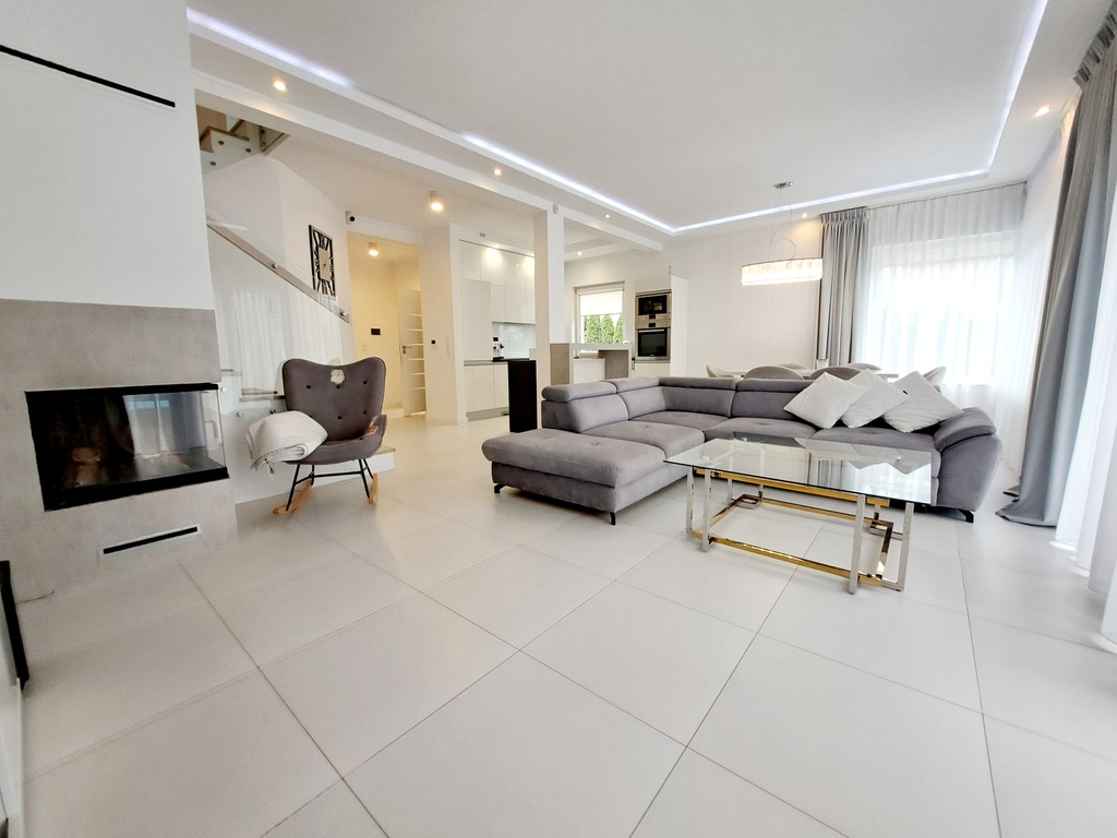 * living room with dining room and fireplace has direct access to a large garden with a terrace. The mood and comfort are created by furniture: a modern sofa, a rocking chair, lamps and other LED lighting, beautiful curtains, all in shades of gray and white