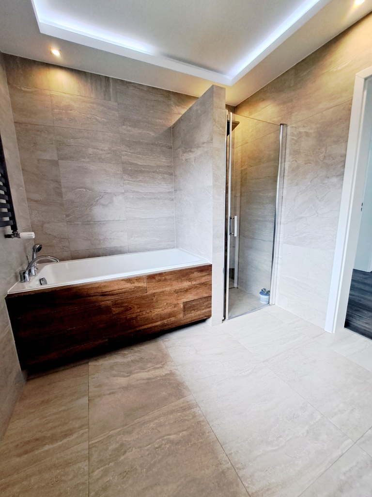 * a large bathroom with a bathtub and shower is located centrally