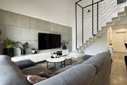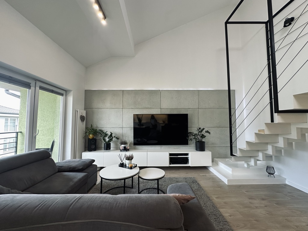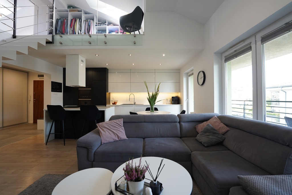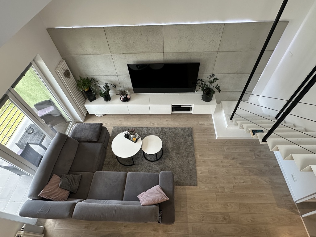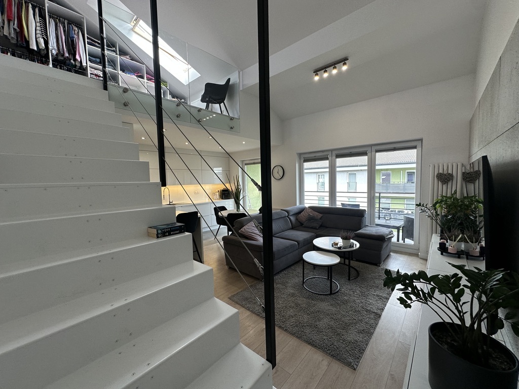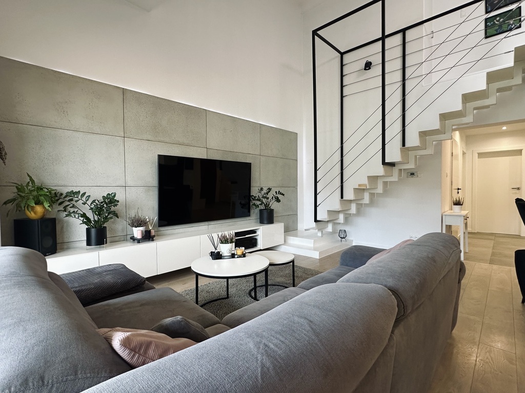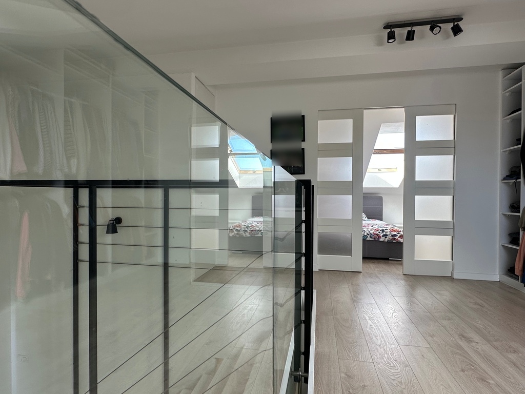 For sale: a modern and spacious apartment with a mezzanine, a 5.6 m high ceiling and a custom-made designer staircase .