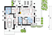 – ground floor (usable area 79 m2): living room with dining area and access to the terrace (23.26 m2), room with access to the terrace (8.28 m2), open kitchen with built-in furniture and household appliances (8.40 m2), pantry (2.59 m2), bathroom with shower, washbasin and toilet (3.96 m2), garage (18.90 m2), boiler room (5.97 m2), vestibule (4.72 m2), hall (2.92 m2);
