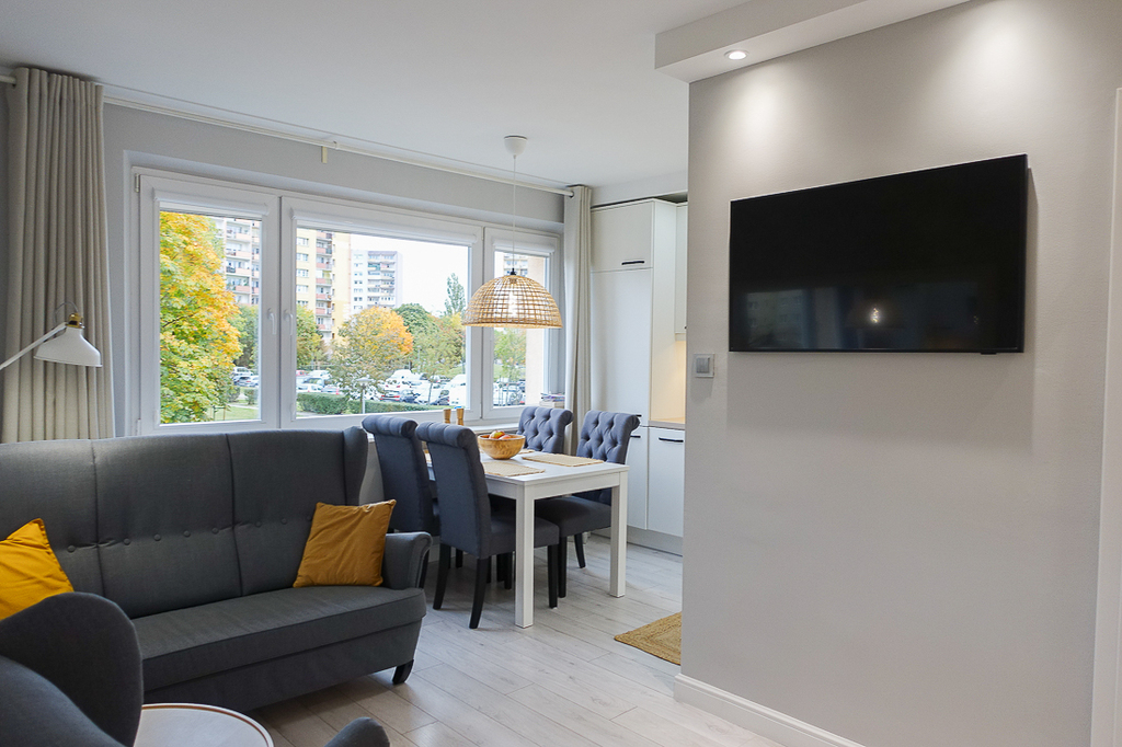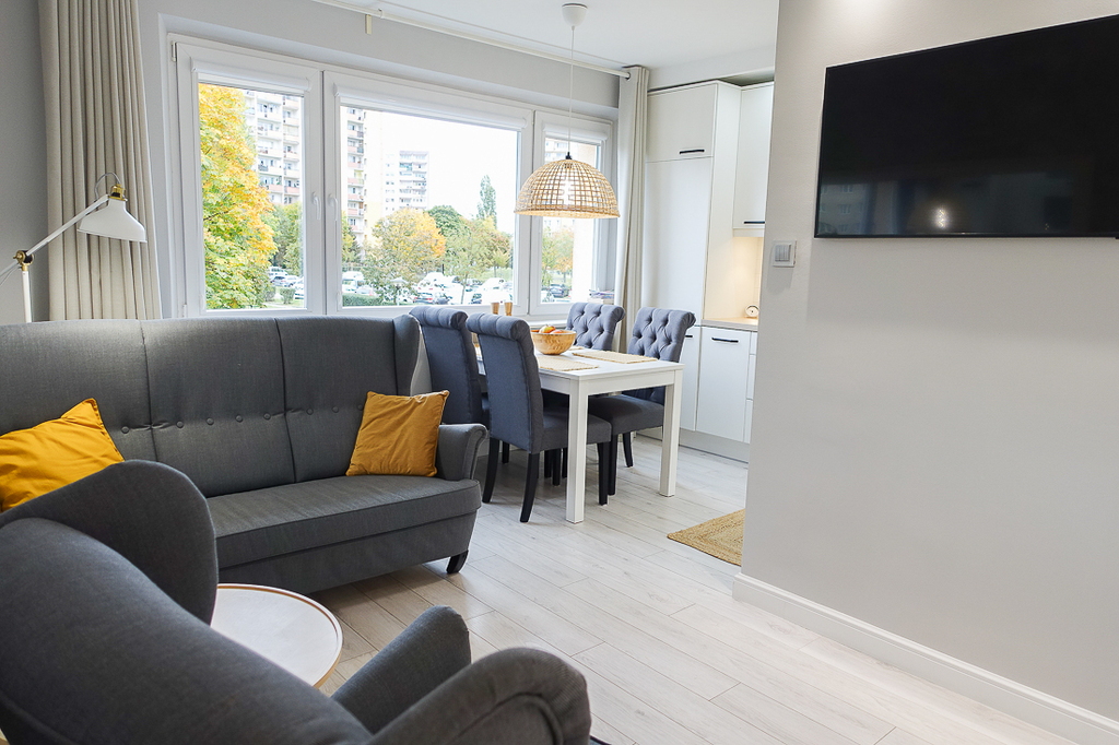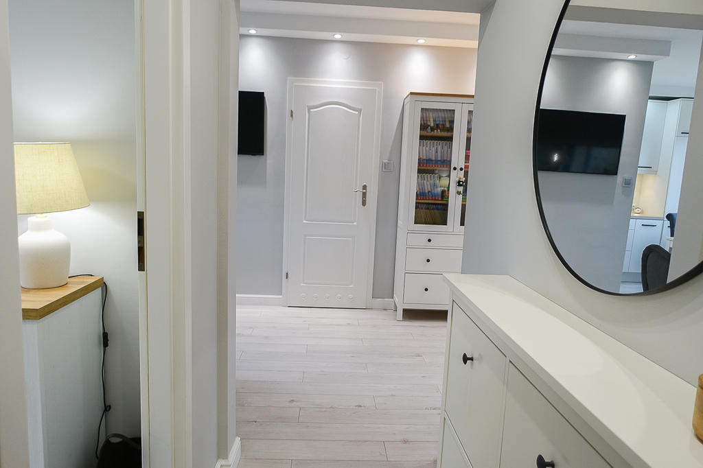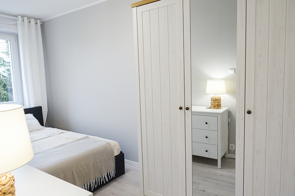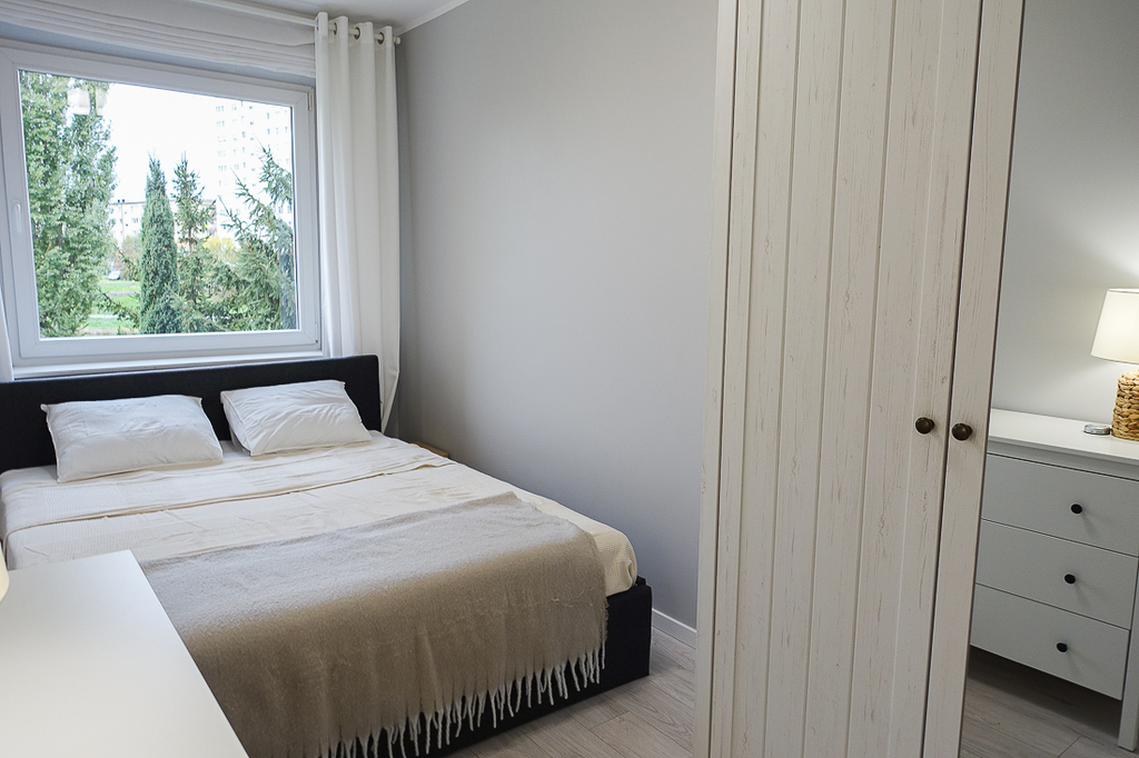 A beautifully designed, modern, and comfortable 4-room apartment, recently renovated, furnished with new furniture and equipped with appliances, boasts a large balcony perfect for morning coffee, overlooking the nearby lake and trees. The apartment is 63.6 m² in size. It is a two-sided apartment with windows facing northeast and southwest. It is located on the first floor of a low-rise building on Jasna Street. Furniture and appliances are provided at no extra charge. APARTMENT DESCRIPTION: A 16 m² room with a 5.6 m² balcony, furnished for relaxation. A 16.8 m² L-shaped room with a kitchenette and a comfortable dining area was created by combining the living room and kitchen with a window. Alternatively, the previous layout could be restored to create a living room and a separate kitchen with a window. The kitchen features new built-in furniture, including a dishwasher, a gas stove with an electric oven, a modern white extractor hood, and a built-in refrigerator with a freezer. Two rooms: a 10.6 m² bedroom and an 8.1 m² study. The bathroom has undergone a complete renovation and includes a shower, a toilet with a Geberit system, a large mirror, a sink with a cabinet, and a built-in washing machine, shelves for towels, household chemicals, etc. This space provides space for a clothes dryer. The bathroom, a combination of a bathroom and toilet, has a renovated area of 4.7 m². The hall is a 5.5 m² square, a room with a balcony, and a 10.6 m² room on the southwest side, while the room with a kitchenette and the smallest room face northeast. New PVC windows, new flooring, new furniture and appliances. New, bright, modern door joinery. Smooth, painted walls. Rent: PLN 740, district heating, municipal hot water. BUILDING DESCRIPTION: Four-story building from the 1980s, constructed of prefabricated concrete panels. The building is insulated. The cooperative plans to replace the balconies and clean the facades. NEIGHBORHOOD: Nearby, there's a construction site, developed infrastructure, shops, schools, kindergartens, and public bus service. I recommend this property because it offers immediate move-in into a furnished and equipped apartment.