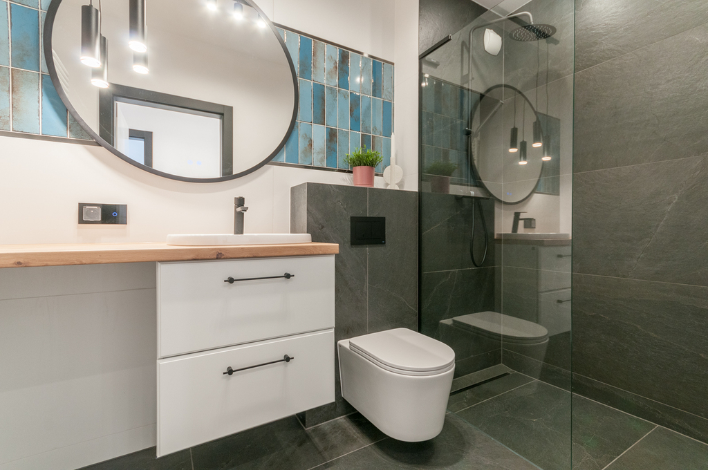 * bathroom finished with tiles, with a walk-in shower; built-in Geberit, cabinet with a washbasin,