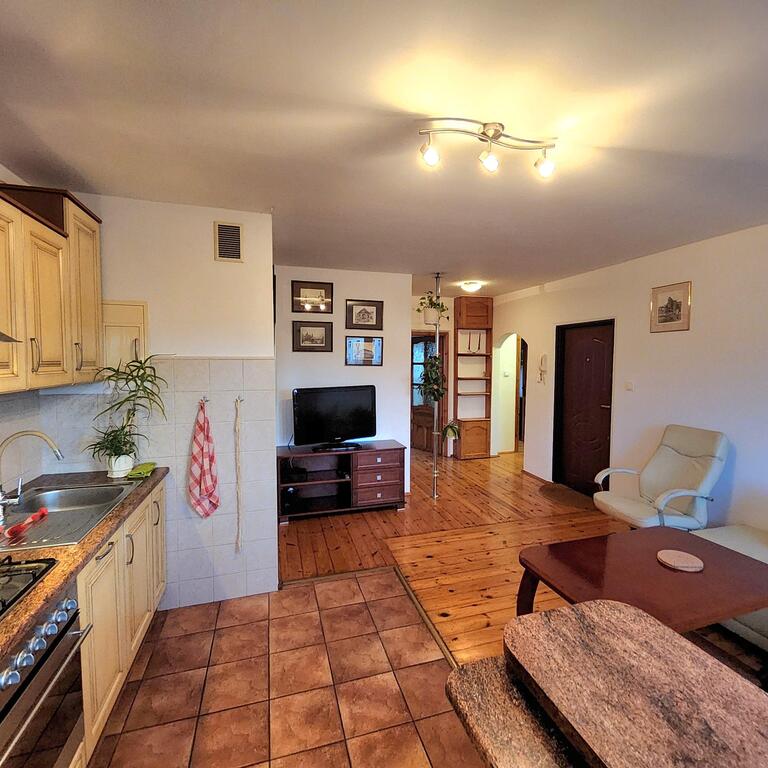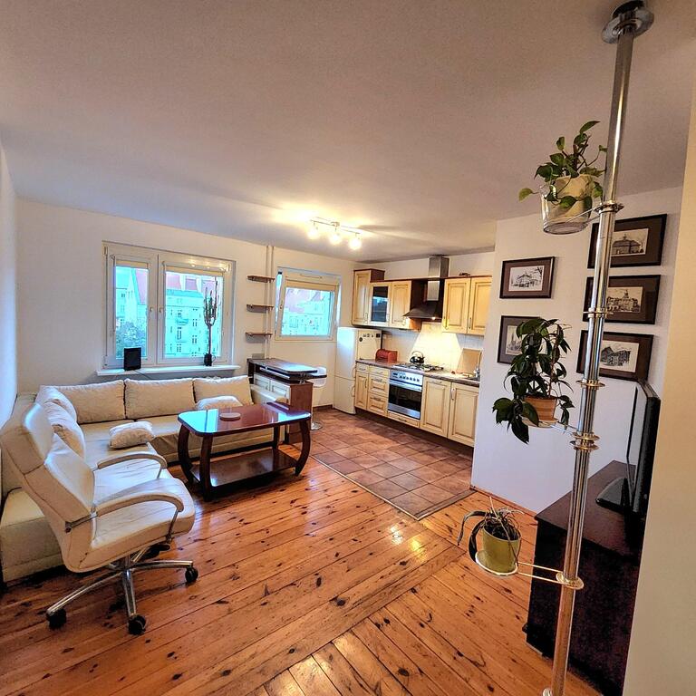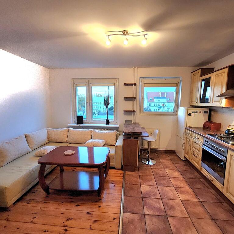 For rent, a three-room apartment is located on the fourth floor of a five-story building. The 64m² apartment comprises a living room with a kitchenette (totaling approximately 20m²), a large bedroom with balcony access, a smaller room (approximately 10m²), and a bathroom with a toilet. The apartment has ample wardrobe space. It is fully furnished and equipped with appliances (washing machine, refrigerator, dishwasher, and TV). The walls are painted, the floors are wood and terracotta, and the windows are PVC. The rent includes electricity, gas for the gas stove, and internet and TV (120 PLN). The building is located in a gated community. Parking is available in the spacious courtyard. Numerous shops, schools, and public transportation (buses and trams) are nearby. I highly recommend and invite you to a viewing.