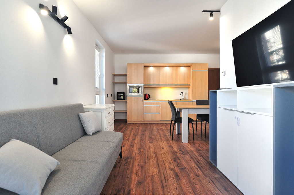We exclusively offer a two-room apartment with a balcony for rent, located on Kazimierza Królewicza Street in Szczecin. APARTMENT DESCRIPTION: This apartment is located on the third floor of a five-story building with an elevator. Its total area is 43.80 m² and it is fully furnished and equipped. The apartment comprises two rooms, one with a kitchenette, and a bathroom with a toilet. The bathroom is equipped with a shower, sink, toilet, washing machine, and a towel rail radiator. The kitchen area is furnished and equipped with appliances. The bedroom has a bed with a comfortable mattress and a wardrobe. Both the bedroom and the living room have access to the balcony. SURROUNDINGS: Very quiet neighborhood. Nearby are a nursery and kindergarten, the Electrical and Electronics School Complex, grocery stores, a gym, and a restaurant. Public transport stops with day and night lines are also nearby. COSTS: Upon payment, approximately PLN 230.56 of administrative fees must be added to the PLN 2,500 rent. Additionally, utility bills and electricity are billed based on usage. We invite you to a viewing.