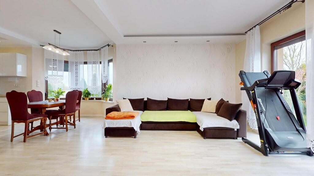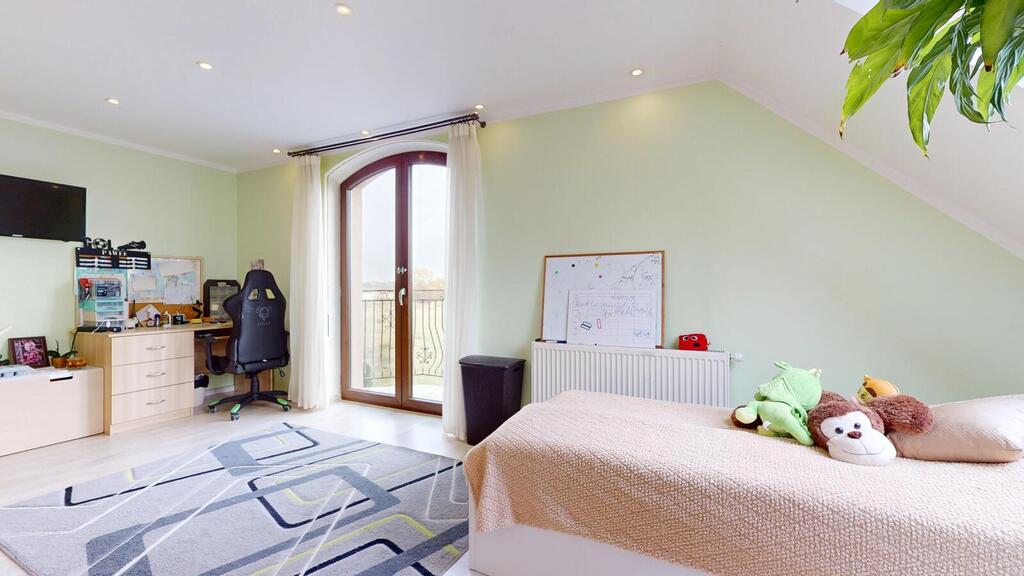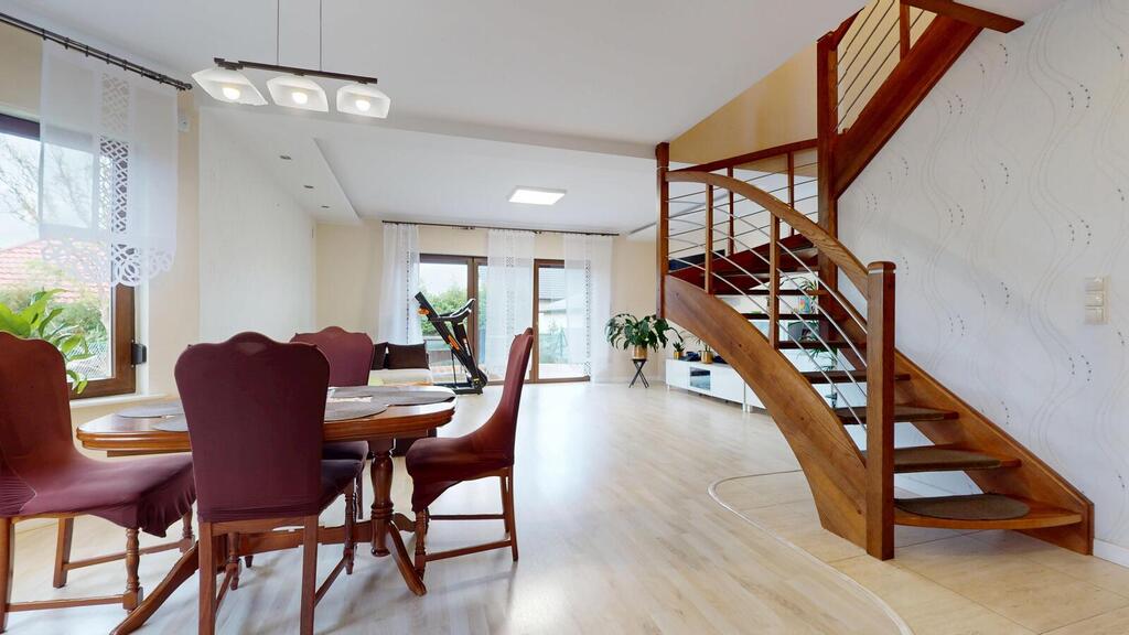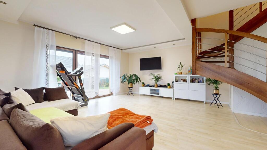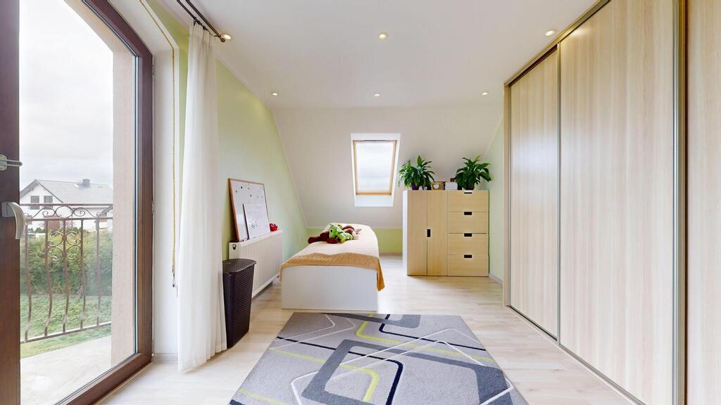 A detached house, situated in a charming location, the plot borders the NATURA 2000 area. Regular plot with a beautifully landscaped garden, with automatic irrigation, fully fenced. The house consists of: ground floor with: – spacious living room, – open kitchen, – toilet, – hall, – single garage, – boiler room. On the first floor: – 3 rooms adjustable, – large bathroom, – hall. An additional advantage is the developed, heated attic. The house has amenities in the form of photovoltaic panels, an alarm, electric roller shutters. Heating at the moment from a pellet stove, gas is on the way, you can change to gas heating. I recommend it due to the layout and standard of the house. I invite you to the presentation.
