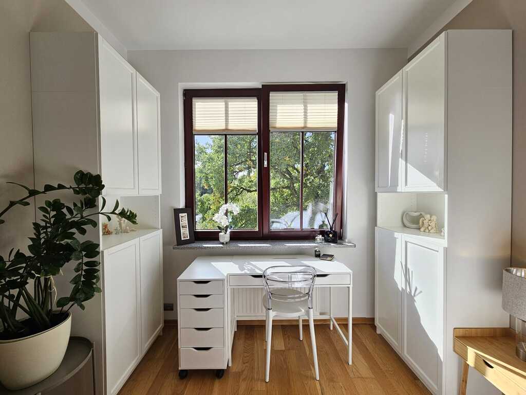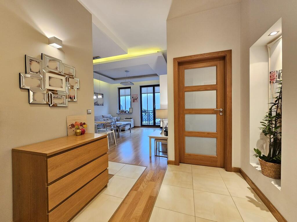We offer you a sunny, tastefully furnished apartment located in the gated, monitored Garden House Apartments complex in Warsaw. This two-story apartment building, built in 2007 and boasting interesting architecture, is a modern, barrier-free building equipped with a quiet elevator, a garage, and a fitness room. A parking space is available under the building and a 3.7m² storage unit for an additional PLN 300. A second space is available for an additional PLN 300. Furnishing and equipment are partially negotiable. The spacious, well-arranged apartment measures 69.8m² and comprises a 25m² living room with a kitchenette, two bedrooms (17m² and 13m²), a 6m² bathroom with a toilet, and a 9m² hallway. The living room opens onto a sunny 6m² balcony with a beautiful view of the greenery. The bedroom was originally located in a 17m² room with a large sliding wardrobe. The apartment is suitable for a family of 2+1 or 2+2. It has three spacious, custom-made wardrobes. PLEASE NOTE: The furniture included in the offer is as follows: Living room: TV cabinets + wall-mounted posts. No corner sofa, dining table with chairs, or TV equipment. Kitchen equipped with appliances such as a dishwasher, oven, electric hob, and fridge-freezer. Bedroom: wall-mounted shelves. No bed, desk, or TV equipment. Children's room: children's bunk bed, bookshelf, cabinet, and desk. Hallway: wall-mounted cabinet, chest of drawers, shoe cabinet. Bathroom: no washing machine. The apartment is well-maintained, designed by an interior designer in warm colors. Wooden windows with granite sills add to its charm. The living room and smaller bedroom face southwest, while the children's room faces east. The bedrooms feature oak-colored floorboards. All windows have pleated blinds. Wooden oak doors throughout. Ample decorative lighting. What sets this apartment apart from others? Here are the key features: * Functional layout, three spacious walk-in closets * Sunny balcony with a unique view year-round * Suspended, decorative ceilings – apartment height is 2.9m * Proximity to schools, bike paths, a park, and essential shops * Intimate, monitored, low-rise development with unique architecture * Gated, monitored area with a safe indoor playground * Hotel-like stairwells with carpeted floors * Residents have access to a 120m² fitness room * Apartment located in a traffic-free area. Additional fees: Administrative fees are PLN 750, which includes heating, a renovation fund (PLN 100), cleaning, estate maintenance, fitness center maintenance, and elevator maintenance. Additionally, advance payments for cold and hot water, and garbage collection total PLN 460 per 4 people. Heating and hot water are provided from the municipal network. The lease is for a minimum of one year, based on occasional leases. Deposit negotiable: PLN 5,000. Release date negotiable. Pet-free clients preferred. This offer is particularly noteworthy due to the comfortable nature of the development and its aesthetically pleasing design. Both families with children and seniors seeking a place away from the hustle and bustle of busy streets will feel at home here. Within easy reach are public transportation 300 meters, schools, a private preschool 50 meters, a church, tennis courts, a swimming pool for children, numerous grocery stores (Lidl, Netto, and Żabka) just 100 meters away, and the Wkrzańska Forest.