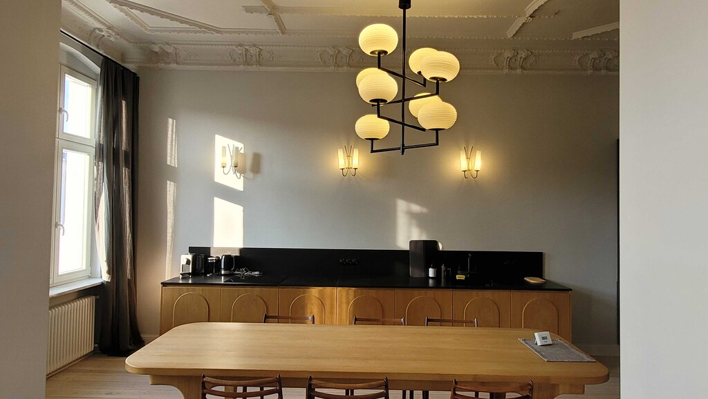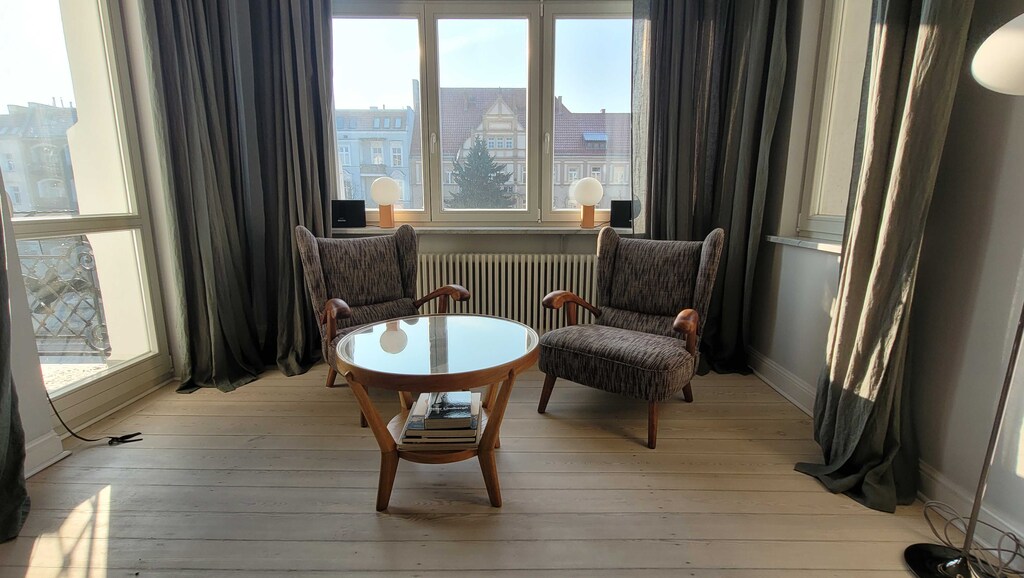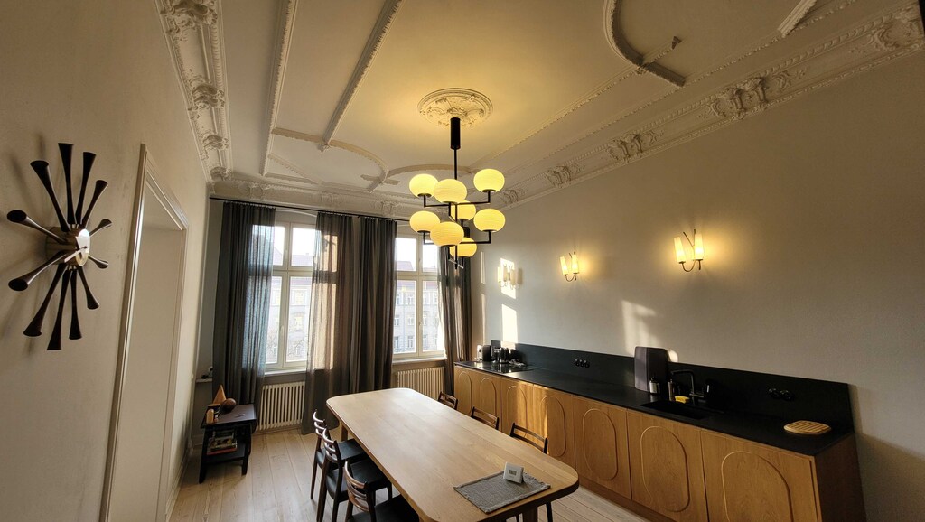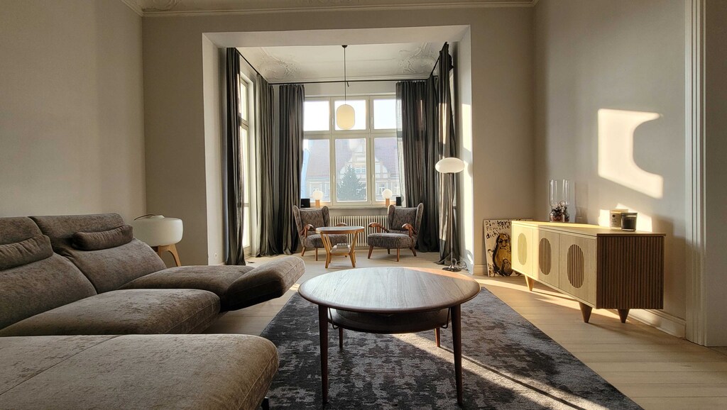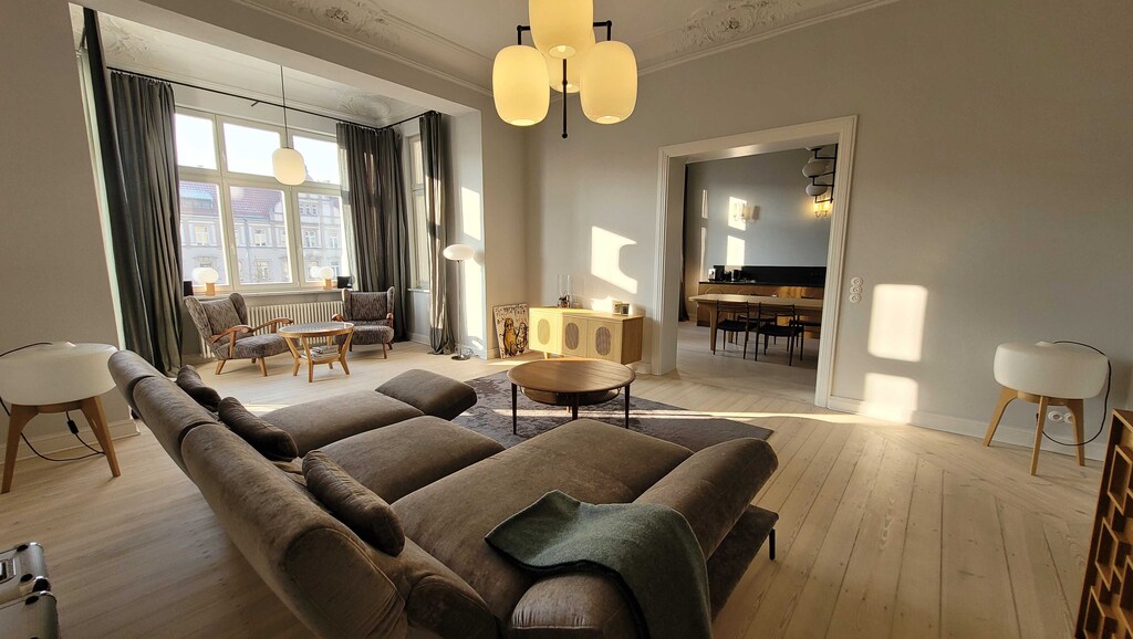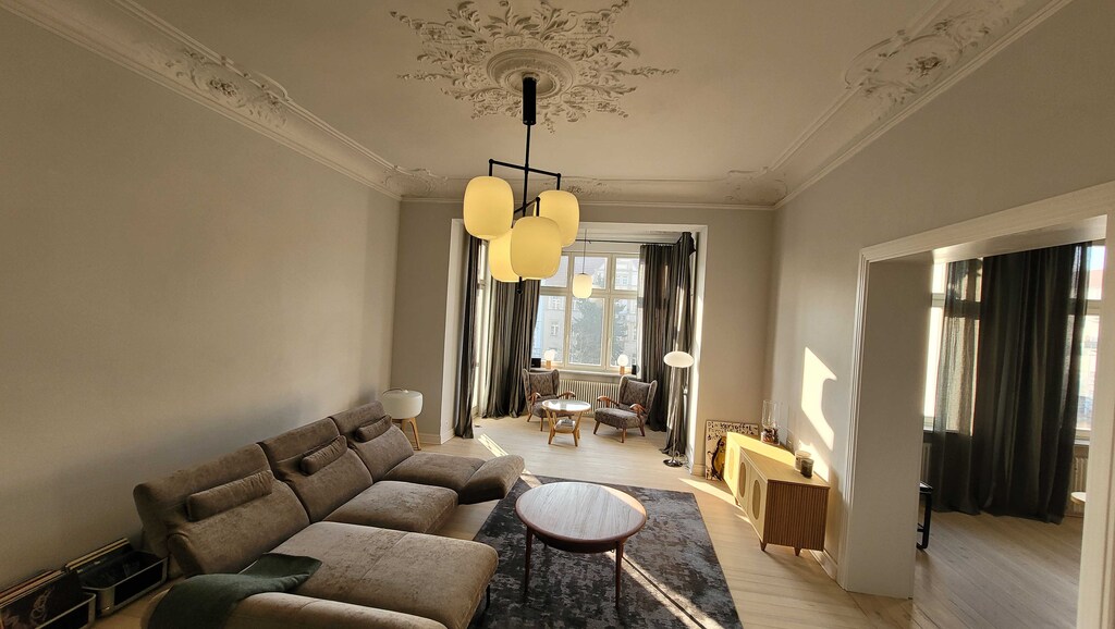 Unique, designer apartment on Jana Pawła II Avenue – 166.61 m² | 5 rooms | balcony | completely renovated. For sale, this spacious, stylish apartment is located on the 2nd floor of an elegant, late 19th-century tenement building, located on one of Szczecin's most beautiful avenues – right next to Jasne Błonia. The apartment has undergone a comprehensive renovation, including a partial remodeling of the room layout, restoration of the historic floors and stucco, and the installation of new door joinery and designer furnishings. Property parameters • Area: 166.61 m² • Floor: 2 (2nd floor) • Number of rooms: 5 + kitchen + 2 bathrooms – master bedroom – 2 children’s rooms – wardrobe / room to be arranged – living room • Balcony: on the alley side • Basement: 15.49 m² Finishing standard • Floors: original parquets / boards – renovated, sanded and whitened • Windows: wooden – replaced during the renovation • Walls: traditional plaster, restored stucco • Doors and interior joinery • Steel door joinery – made by Metal Madness • Custom-made furniture – Woodmaker, Woodeffect Heating • Gas etagene installation • The entire heating installation was replaced during the renovation Fees • PLN 481.84 Equipment The price includes: ✔ kitchen furniture ✔ permanent furniture and wardrobes ✔ built-in furniture ✔ washing machine Other furniture, lighting, lamps, decorations and accessories – negotiable. The interior features unique vintage elements and designs by Niels Otto Møller, Eero Saarinen, Georg Nelson, Joe Colombo, Alvar Aalto, Hans J. Wegner, and Bill Curry, among others. Location: • A prestigious avenue in the city center • Close to Jasne Błonia and green spaces • A tenement house with a historic atmosphere