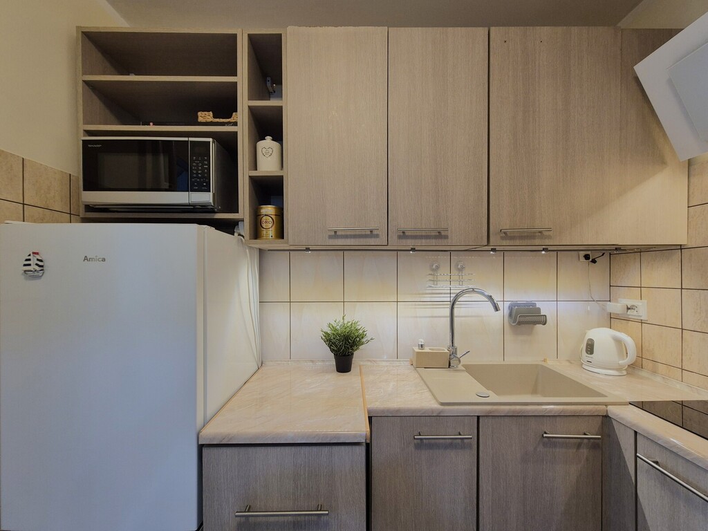 – Kitchenette equipped with the necessary appliances: refrigerator, kitchen furniture, two-burner electric hob, hood, sink and dishwasher;