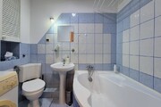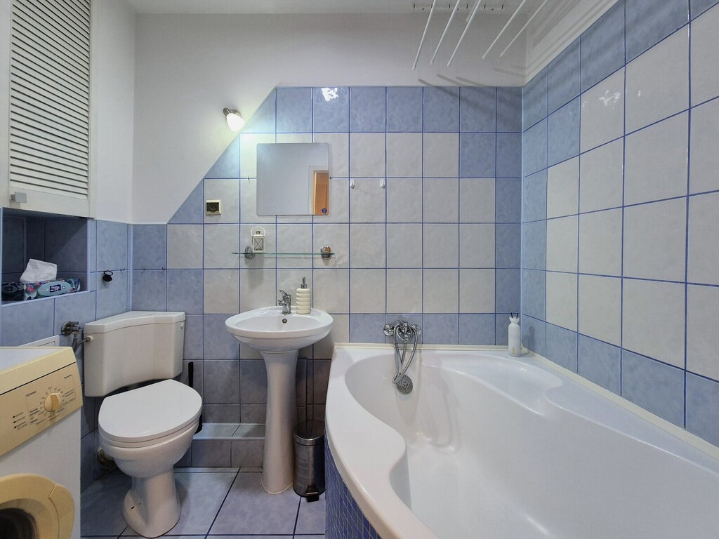 – Bathroom with a large bathtub, washing machine, toilet and sink;