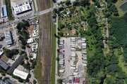 Aerial photos show the actual condition – a flat, paved area with neatly arranged parking spaces and ready infrastructure.