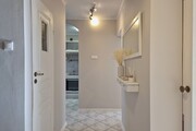 The apartment is move-in ready. The walls were refreshed with neutral, muted colors. The living room and bedroom feature wooden flooring, while the hallway and kitchen feature tile. The windows are PVC. All furnishings are included in the price.