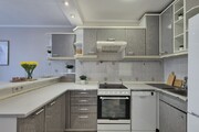 – a bright kitchen with a dining area of 15 sq m with built-in furniture, an electric stove with an oven, a refrigerator and a dishwasher