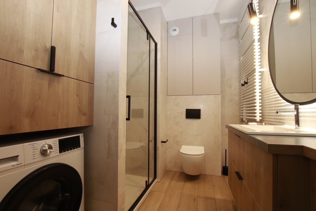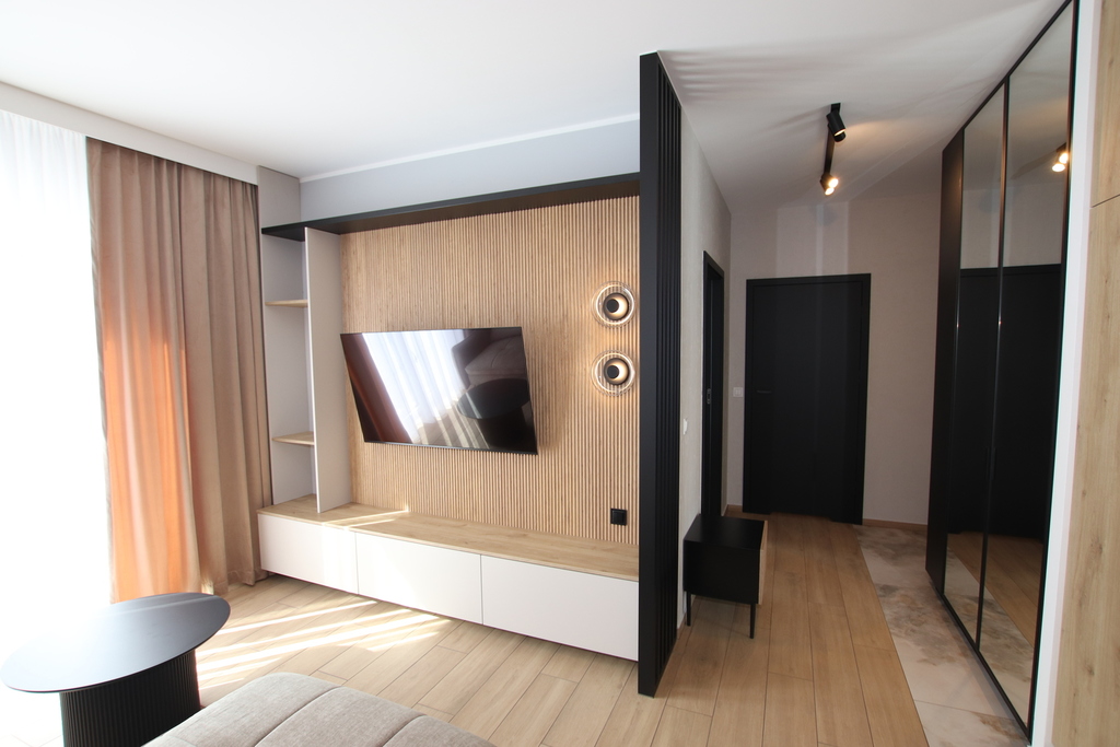 The interior was designed with maximum functionality and everyday comfort in mind. The apartment features ample, cleverly planned storage space, making it very practical and easy to use.