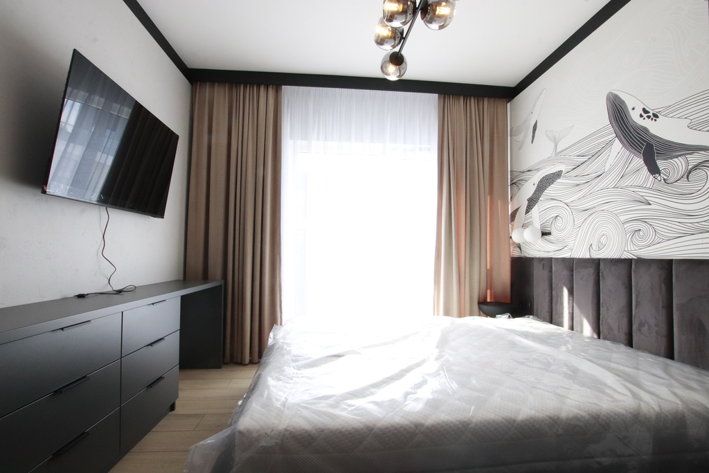The apartment is located in a new, elegant building with an elevator and a garage.
