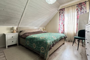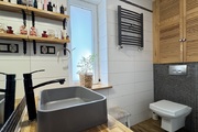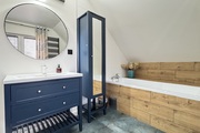 Upstairs, the bedrooms feature wooden ceilings and sloped walls that give them a cosy, Scandinavian feel. Each room is fitted with built-in wardrobes, with additional storage built into the landing corridor — storage space planned down to the last centimetre. The first-floor bathroom is a design statement: a navy blue vanity unit, a wood-panelled bathtub and concrete-look tiles. The washing machine and dryer are also integrated into the bathroom space.