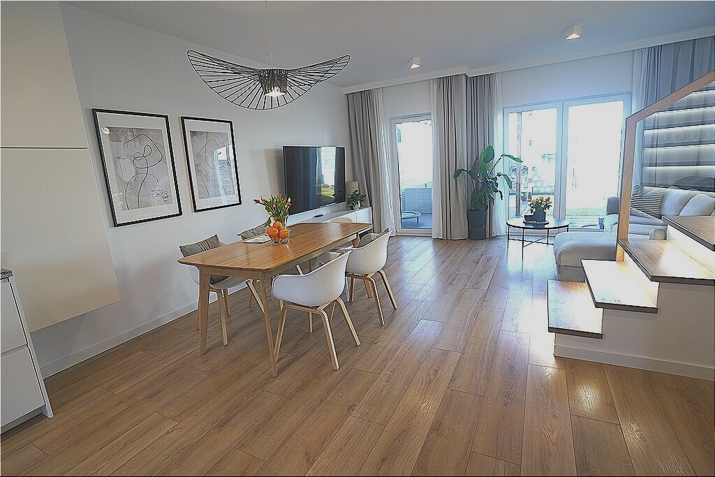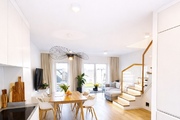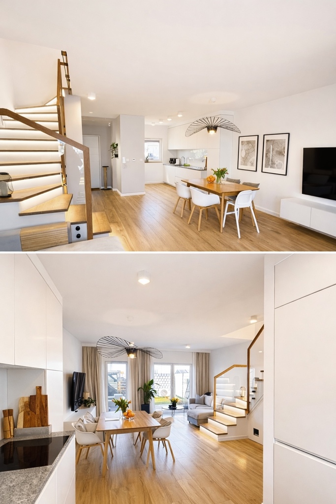 Description: For sale: a unique terraced house in one of Szczecin's most desirable districts—Gumieńce. Built in 2020, the property was finished according to an interior designer's design and is move-in ready with no additional investment. Area and layout: • 78.1 m² living room with kitchen, toilet, three bedrooms, bathroom + additional usable space of 16 m² – ideal as another zone – office, hobby room or additional bedroom • Garden 41 m² in use with a wooden terrace and pergola • 2 parking spaces + 3 guest spaces on the estate Finishing standard: • Custom-made carpentry kitchen – Viscount White granite countertop, matt lacquered fronts, built-in 70 cm refrigerator, built-in oven and dishwasher, induction hob flush with the countertop, Grohe sink and tap • Built-in washer-dryer with heat pump under the stairs (can remain as equipped) • Bathroom: custom-made oak veneer furniture, Laufen washbasin, Hansgrohe/Grohe/Kludi fittings, Tubądzin Torano tiles • Solid oak stairs with glass balustrades and LED backlighting • Custom-made carpentry throughout the house (vestibule, under the stairs, bedroom) • Underfloor heating throughout the house Comfort: • Dual-zone air conditioning – cassette type serving the first floor and living room + separate unit in the attic with heating and cooling function • Attic insulated with PUR foam – very good thermal insulation • Zoned lighting in the living room, light scenes, switch by the bed • Gated community with a gate – security and privacy Maintenance costs below PLN 1,000/month: • Community ~PLN 200 | Gas in winter ~PLN 300 | Garbage ~PLN 130 • Excellent insulation and underfloor heating = real savings all year round A house for demanding customers. Materials and workmanship without compromise. I cordially invite you to viewings.