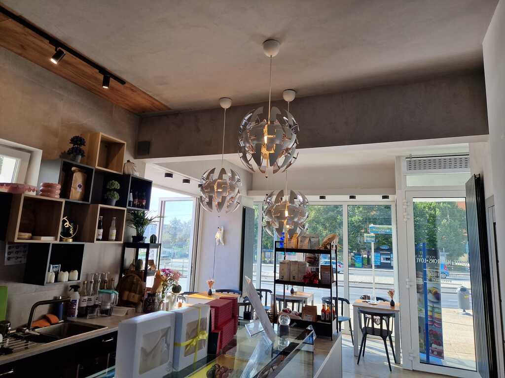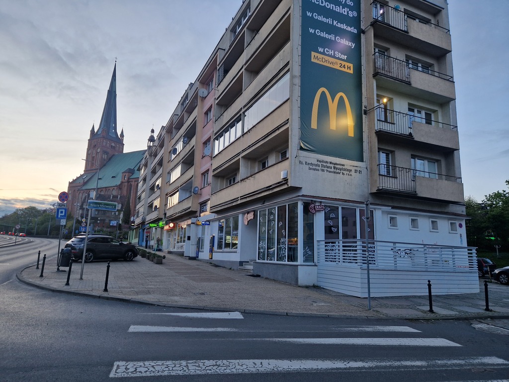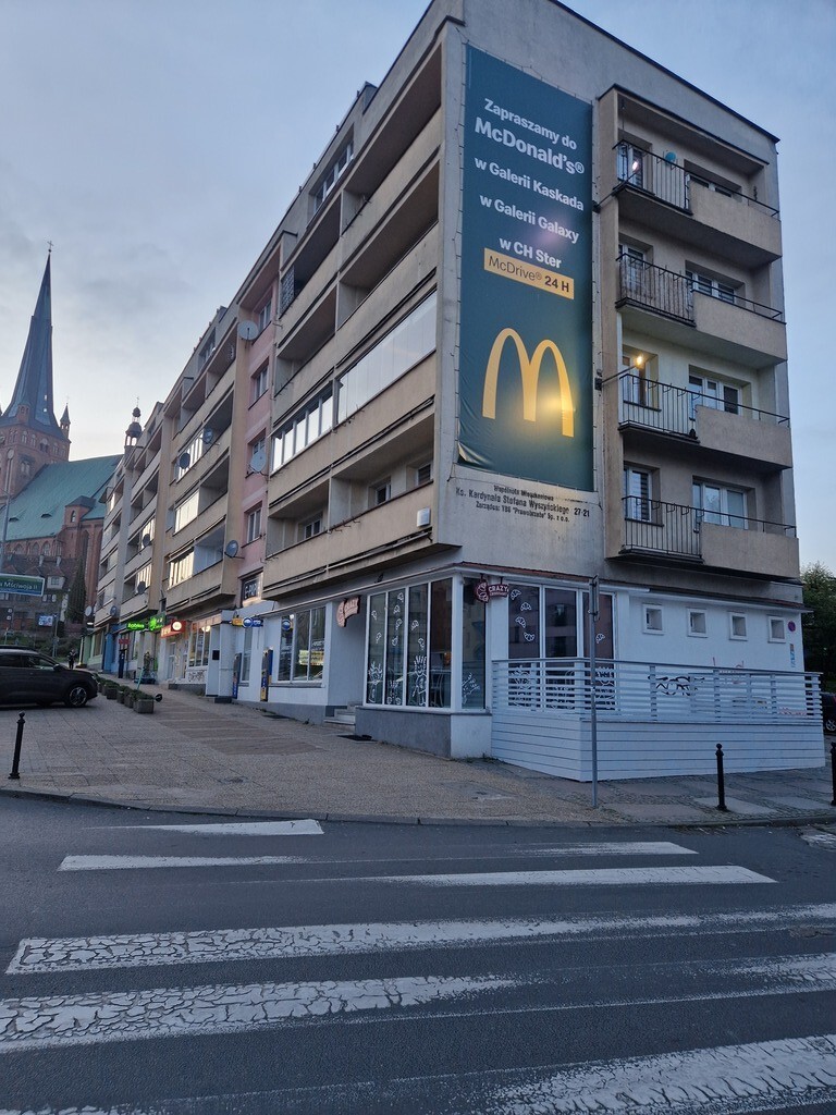 Commercial premises for sale. It has air conditioning and municipal central heating. Currently, it is divided into two smaller ones with separate entrances, one of which is a 70 m2 shop and the other is a catering point with an area of 55 m2. The catering point has two entrances from the street and one from the back. The premises are located in a very attractive part of the city by the shopping street and the main communication artery of Szczecin, Ks. Kard. St. Wyszyńskiego Street, additionally located in the immediate vicinity of public transport bus and tram stops. An additional advantage is the location of two ATMs in the premises. The location guarantees a large flow of pedestrians and vehicles. The premises are rented and bring a steady income with a 12-year rate of return.