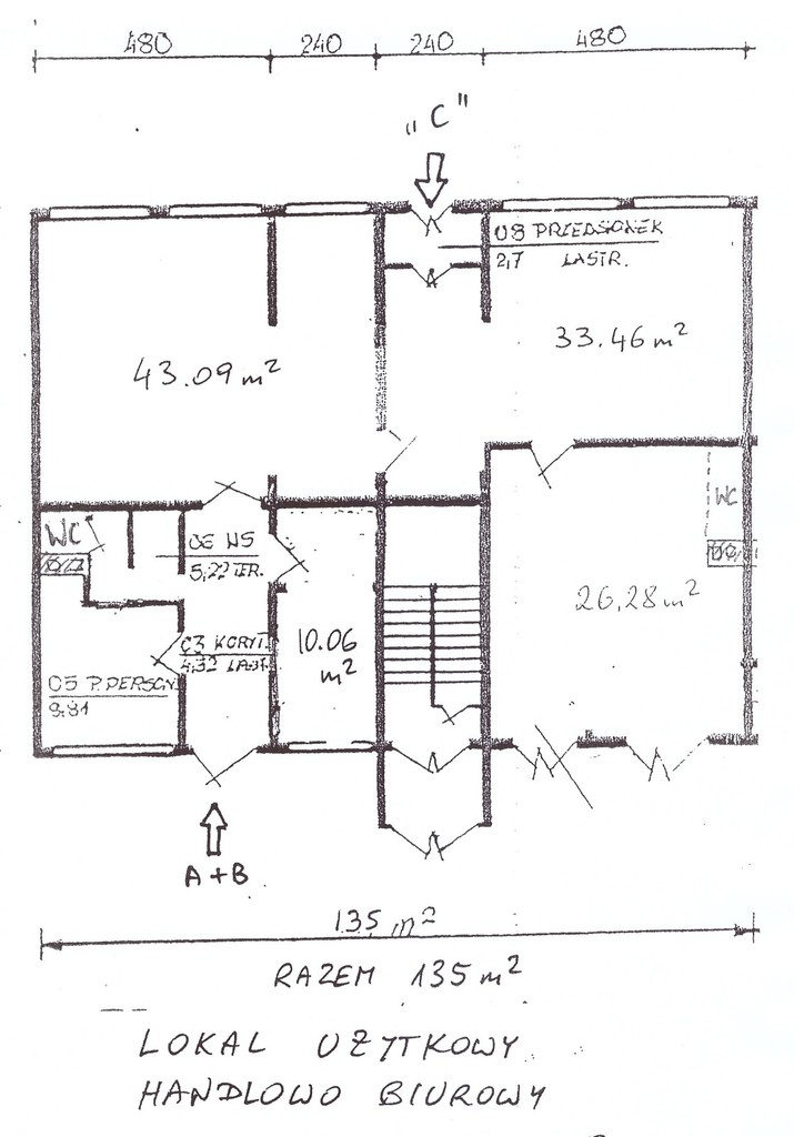 A very interesting retail and office space in the middle of the estate, located in a 4-story building. Usable area of 135 m2. 5 rooms – (43m2, 33m2, 26m2, 10m2, 10m2) and a room social. Entrance to the premises from two sides of the building – one with a glass vestibule and two smaller ones. Large shop windows, PVC windows. Carpeted floors, terracotta toilet. The layout of the rooms allows you to conduct three separate activities. Lots of parking spaces nearby. Rent to the cooperative PLN 2400 including water, heating and FR. Additional charges – energy, phone, internet. The property has an alarm security. I recommend