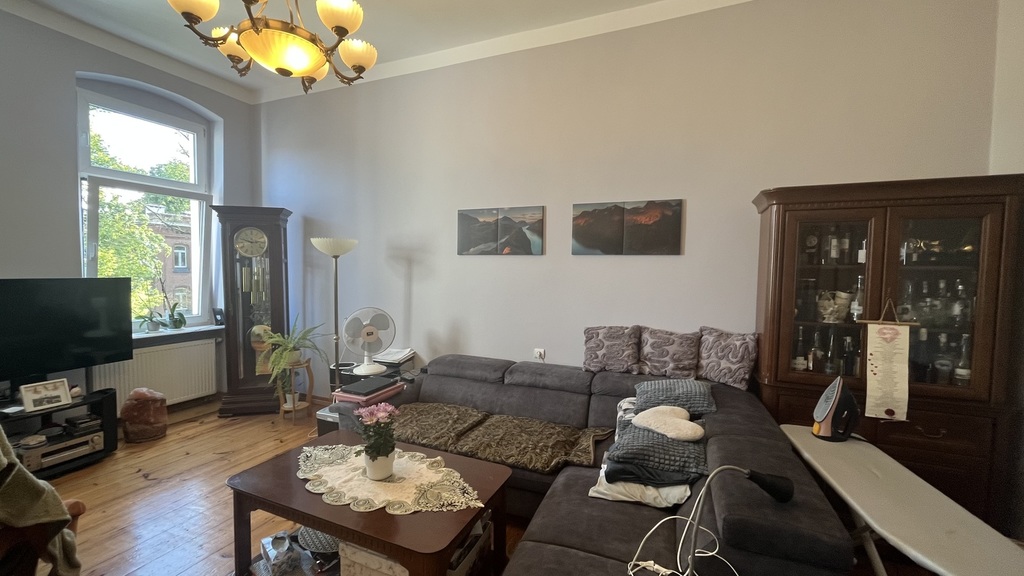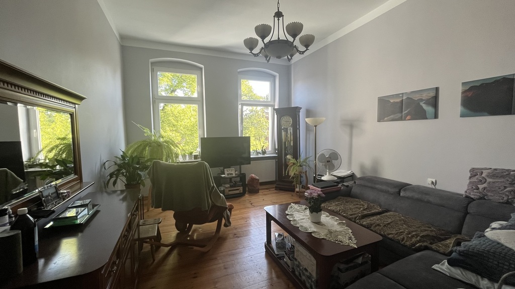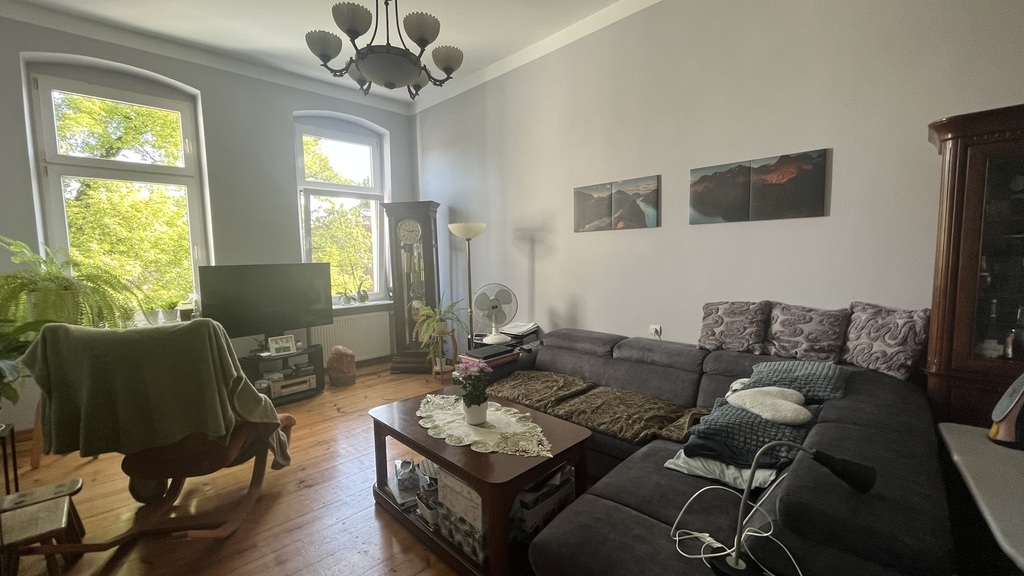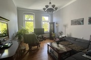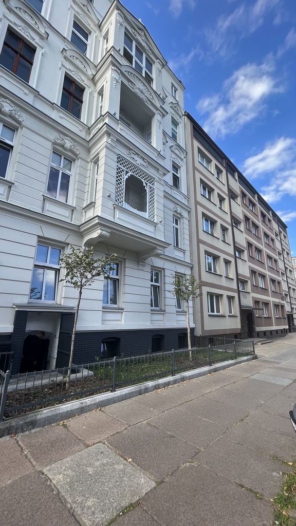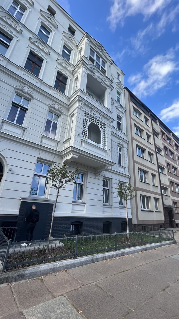 The apartment is located on the second floor of a tenement house – the staircase has been completely renovated, as well as the entire tenement house, a quiet place, lots of greenery. The apartment consists of four rooms and a fifth large wardrobe with a window of the area of 11m2, which can also be used as an additional room. The apartment consists of a large living room with an area of about 25m2, bedroom with an area 27m2, which is connected with a large wardrobe with a window, a room with a balcony of the area 15m2 and a spacious fourth room with an area of 20m2. A large, spacious kitchen with new kitchen furniture, which is included in the price of the apartment, including household appliances. The apartment has two bathrooms: one large with a window in a new glaze and terracotta with a bathtub with hydro massage and the other with a shower cubicle. There is also a second independent kitchen in the apartment. As the apartment has two separate bathrooms and kitchens, it can be very functional even for a family of two generations. The apartment is very well maintained and has undergone a general renovation: all installations in the apartment have been replaced, the walls are covered with plaster in pastel colors, the floors are original German sanded plank, the door woodwork is also original, new heating and radiators, etc. komandor. The rent is low, because with such a large area of 130m2 it is PLN 1,000 from PLN. The apartment has a very nice and pleasant atmosphere. I recommend and invite you.