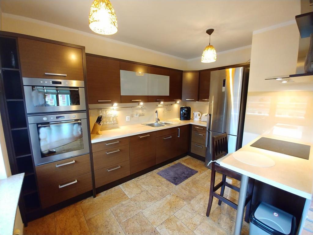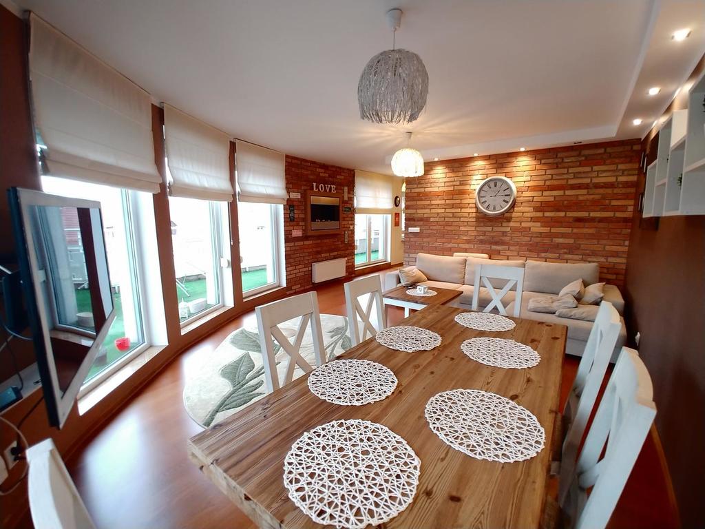 A comfortable, fully equipped, high standard 2-level apartment with a large terrace of 20 m2. The apartment is located on the 5th floor, in a monitored building from 2009, in the very center of Szczecin. A quiet elevator and a wheelchair room are available. Nearby there is a park and a Jordan garden with a playground for children. The area of 85 m2 consists of an original living room with one of the walls in the shape of an arch, with French windows and a panoramic view of the city. An additional advantage of the living room is a bio-fireplace and access to a terrace with artificial grass with an area of 20 m2 (east-south exposure). In the living room there is a large and comfortable seating area, a 50-inch TV, a wooden table for 6 people in the Provençal style. On the first level there is also a hall with a large built-in wardrobe, a toilet and a kitchen equipped with the highest energy-saving equipment (built-in oven, microwave, dishwasher, hood, hob and fridge with freezer). On the second level there is a bathroom finished with marble tiles and two complete bedrooms. There are boards on the floor, granite tiles, plastic windows. The apartment is fully equipped and furnished, with plenty of wardrobes, shelves for clothes and underwear. Upon request, the apartment can be additionally equipped. Long-term rental is preferred, also for companies. Additional fees include monthly rent of PLN 470, UPC (Internet and TV) PLN 95, SEC (district heating and hot water heating) and bimonthly ZWiK and Enea. Deposit in the amount of PLN 5,000. The owner will consider small pets with an additional deposit. Release date from mid-May 2024. I recommend and invite you to cooperate.