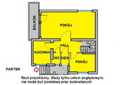 Parter: pokój dzienny (ok. 31,5 m2) z przyległym balkonem (loggią), pokój (ok. 10,2 m2), kuchnia (ok. 8,5 m2), wc (ok. 1,2 m2), hol (ok. 8,7 m2), sień (1,9 m2).