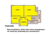 Poddasze: trzy sypialnie (ok. 16 m2, 16 m2, 7 m2), łazienka (ok. 6 m2), korytarz (ok. 7 m2), strych (możliwość przyłączenia i powiększenia łazienki). Do jednego z pokoi przylega balkon.