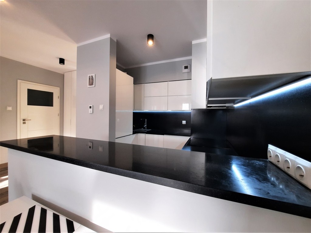 Kuchnia umeblowana i wyposażona w sprzęt agd : lodówka, płyta indukcyjna, piekarnik, zmywarka, okap)
