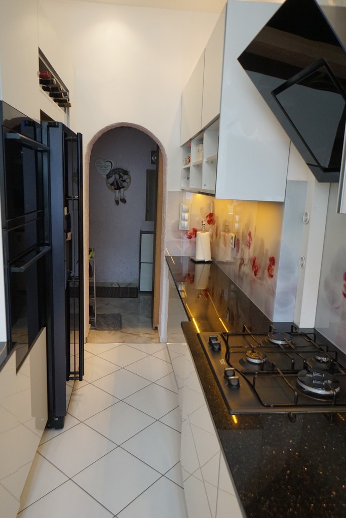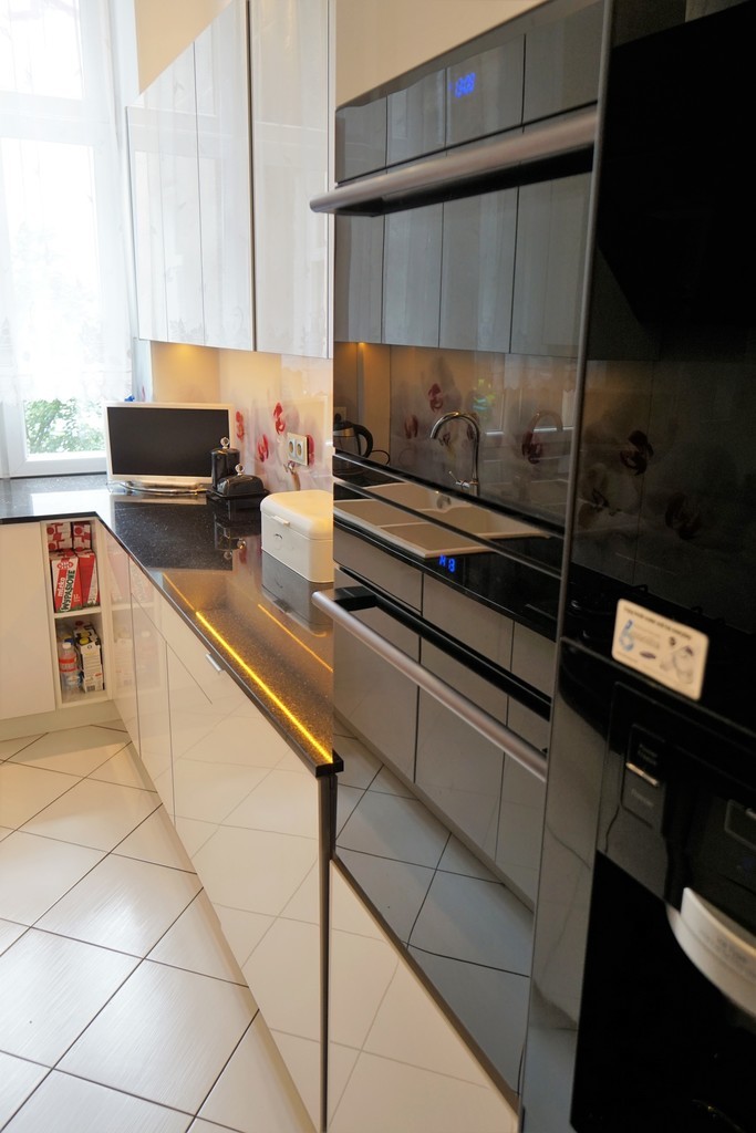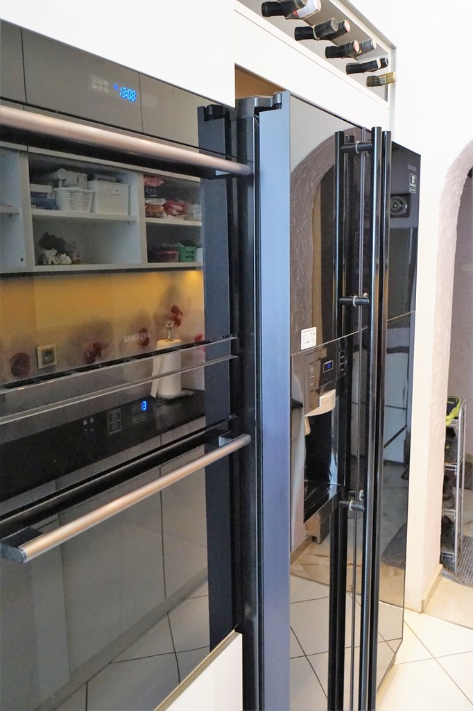 W mieszkaniu znajduje się wysokiej jakości kuchnia w gustownej zabudowie ze sprzętem AGD – lodówka (z kostkarką do lodów), zamrażarka, okap oraz dwa piekarniki marki Samsung.