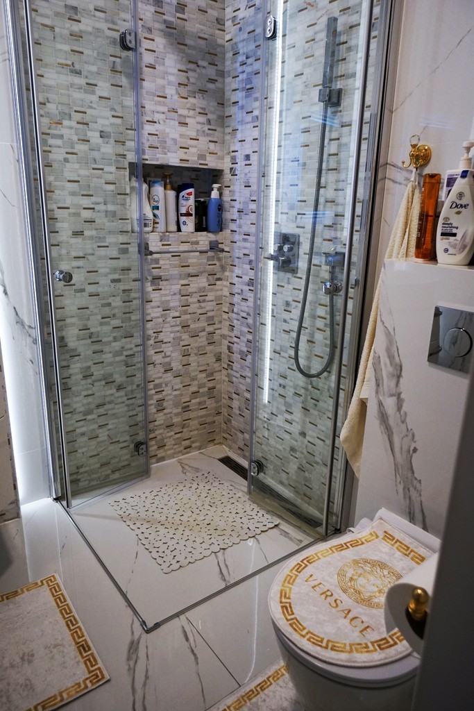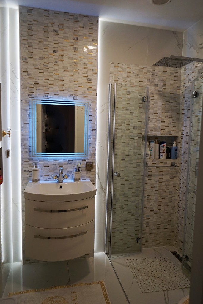 W łazienkach zamontowano piękną armaturę włoską, wysokiej jakości prysznice oraz godne uwagi ledowe oświetlenie.