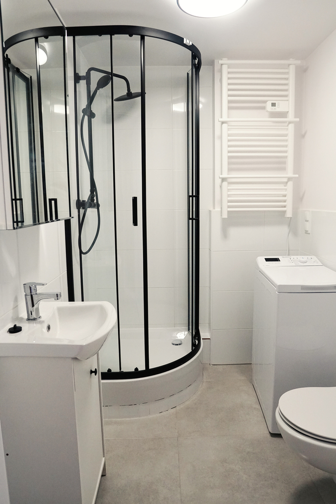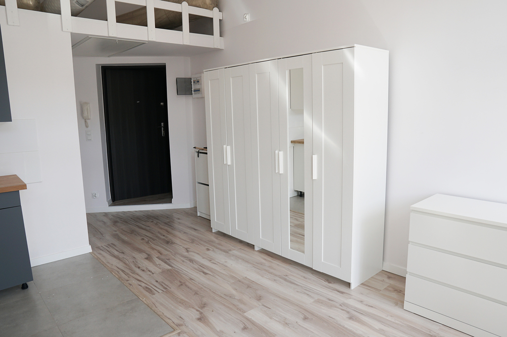Kawalerka 1 posiada duży jasny pokój z wyjściem na balkon, aneks kuchenny i łazienkę. Dużym atutem jest spora antresola gdzie najemca może spać. Łazienka w nowoczesnej kolorystyce. W pełni umeblowane i wyposażone.